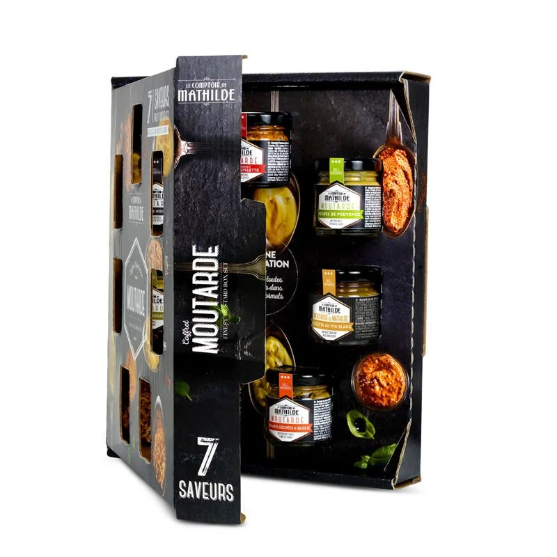Coffret Dégustation Moutardes , Le Comptoir de Mathilde. Un réel voyage gustatif, avec ce coffret de 7 pots de moutarde, qui vous permettront de varier les plaisirs.
