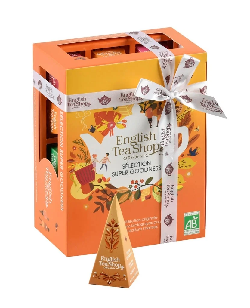 Coffret Prismes Super Goodness English Tea, Nature et Expression. Une sélection de thés et d’infusions biologiques aux super-ingrédients dans un coffret entièrement éco-conçu. Un assortiment de 6 mélanges uniques pour vous faire profiter des bénéfices de fruits et légumes, de plantes et d’épices pour un coup de boost tout en naturalité. Les sachets pyramides gardent les feuilles de thés entières et permettent aux ingrédients de libérer tous leurs arômes lors de l’infusion.