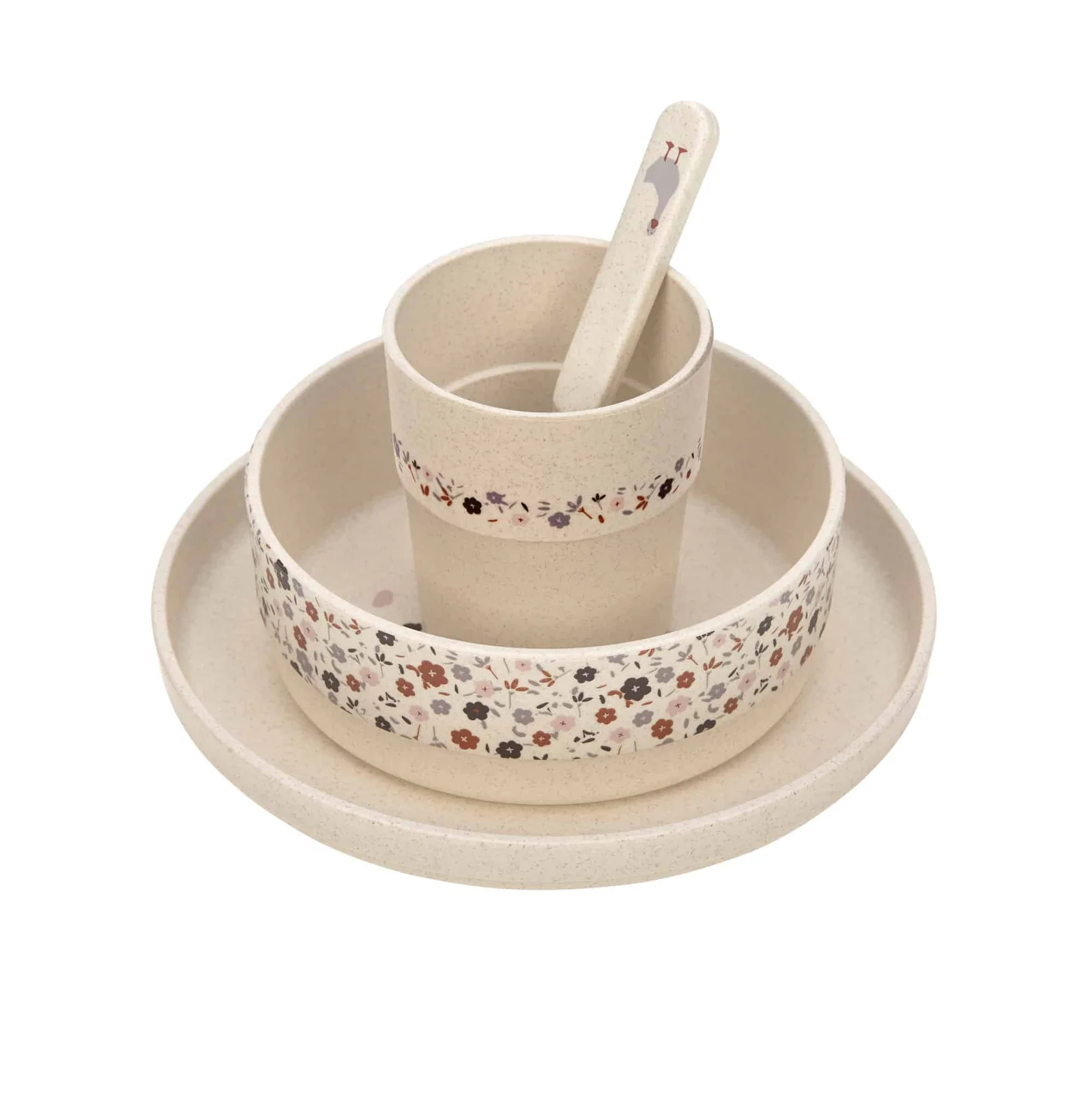 Il comprend une assiette, un bol, une tasse et une cuillère. Pour garantir une stabilité sur la table, un anneau antidérapant en silicone est ajouté sous chaque pièce de vaisselle.