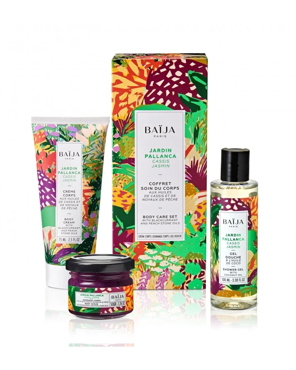 Coffret Soins Corps Jardin Pallanca, Baïja. Nous avons réuni dans ce coffret 3 soins pour le corps à la pétillante fragrance de cassis, jasmin et musc blanc. – Un gel douche – Un exfoliant – Une Crème