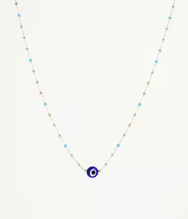 Collier chaîne chapelet en acier uni et doré à l’or fin sur lequel est attaché un motif de résine coloré représentant un petit œil protecteur.