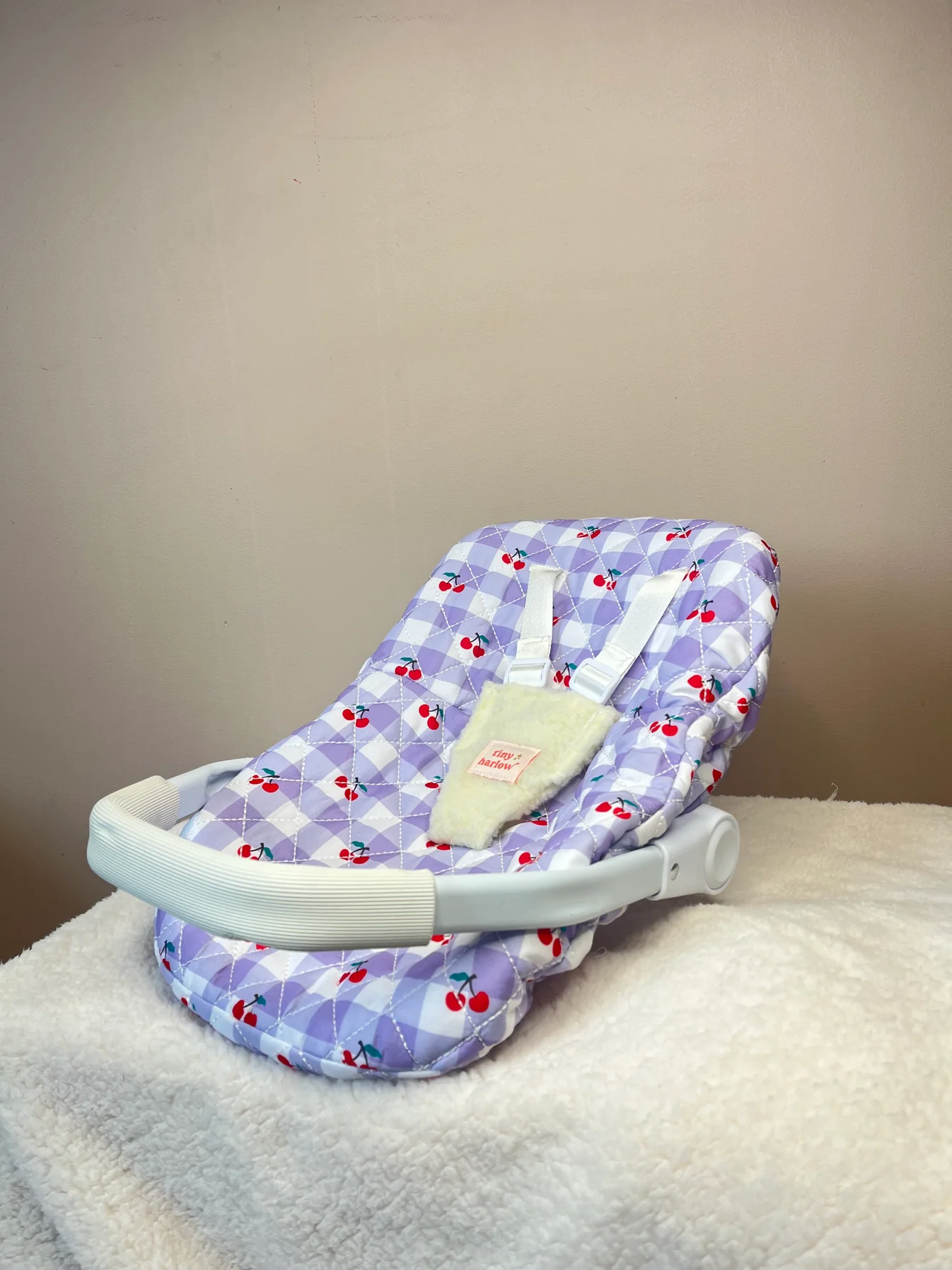 Coque Vichy Violet à Cerise – Tiny Harlow Coque de poupée Tiny Harlow au motif vichy violet à cerise, avec poignée dorée, intérieur moelleux et look rétro chic. Convient aux poupées jusqu’à 45 cm. Compatible avec la poussette Sherpa. À partir de 3 ans.