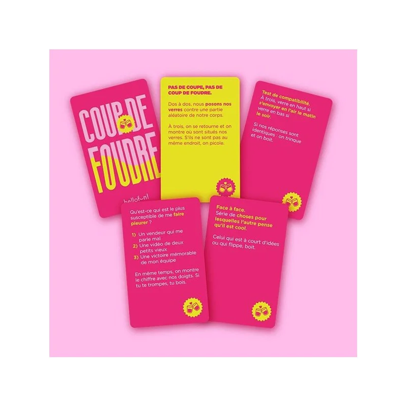 Coup de Foudre, HELLOFUN Coup de Foudre, HELLOFUN est le jeu idéal pour animer vos soirées en couple ! Plongez dans des questions audacieuses, absurdes et intimes qui transformeront chaque rencontre en un moment mémorable. Que ce soit autour d’un verre de vin ou d’une bière, ce jeu promet des rires et des découvertes. Facile à transporter, il est parfait pour renforcer vos liens tout en vous amusant.