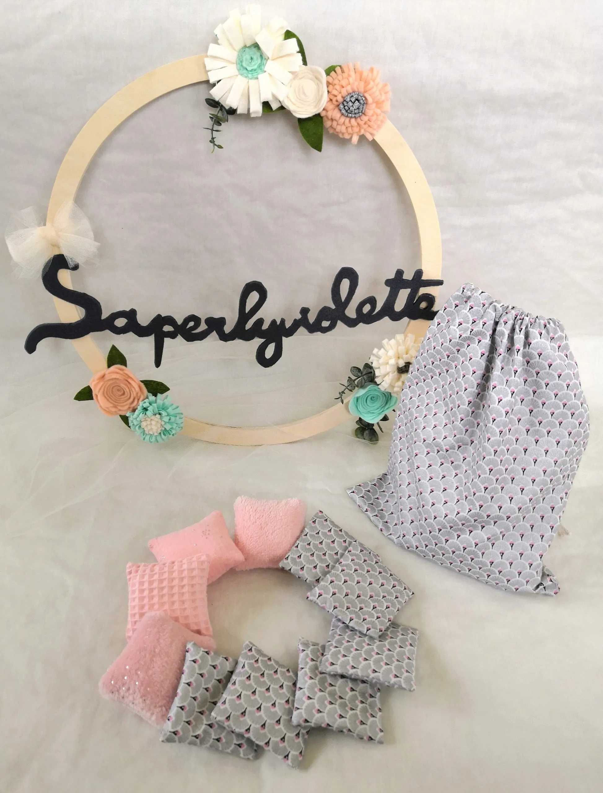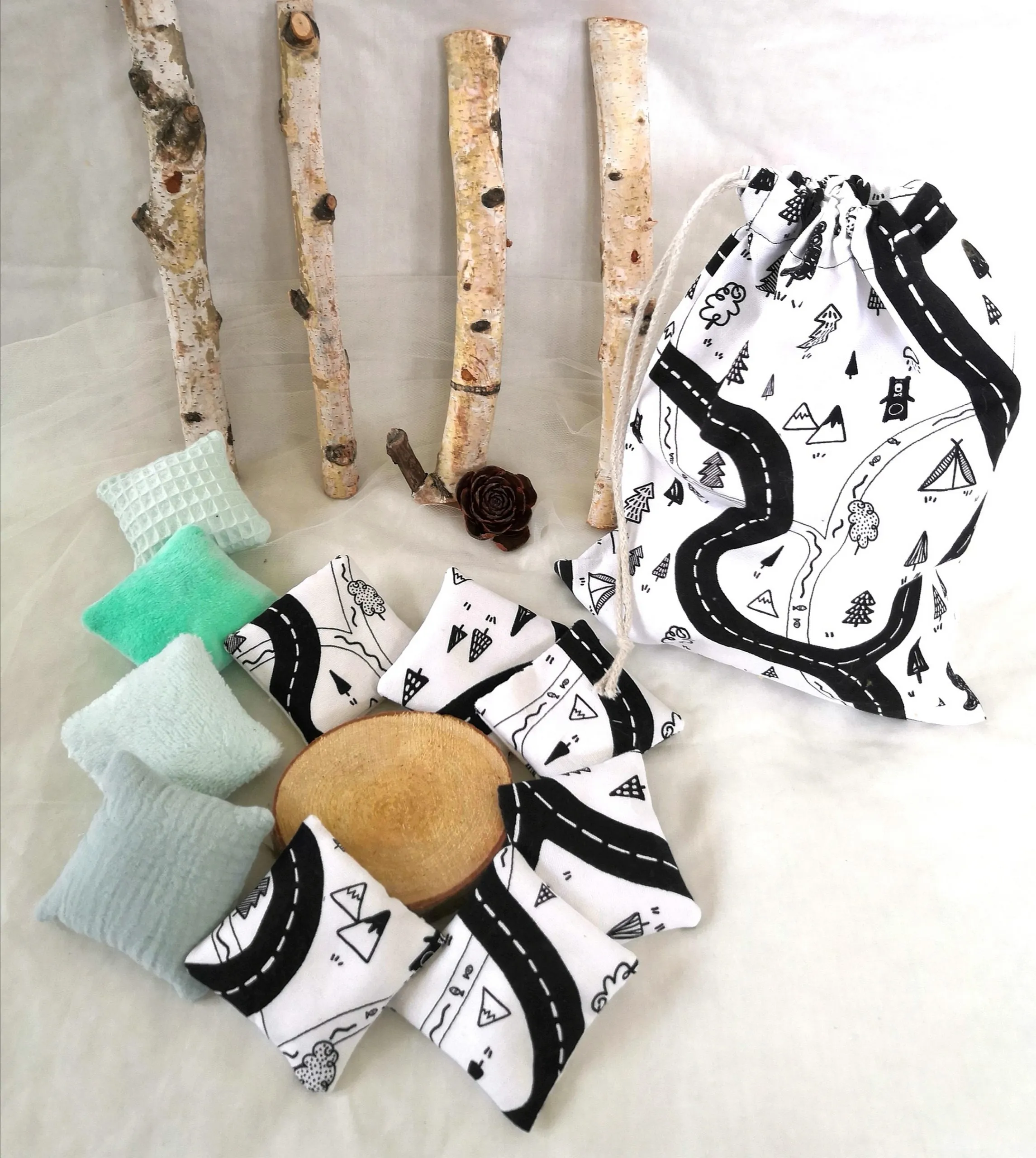 10 petits coussins et leur pochon. Faciles à manipuler. Jeu idéal pour développer le sens tactile et le sens de l’observation. Une activité inspirée de la méthode Montessori qui favorise la concentration. Peut-être réaliser en commande sur mesure dans d’autres coloris (contactez-moi pour plus d’infos).