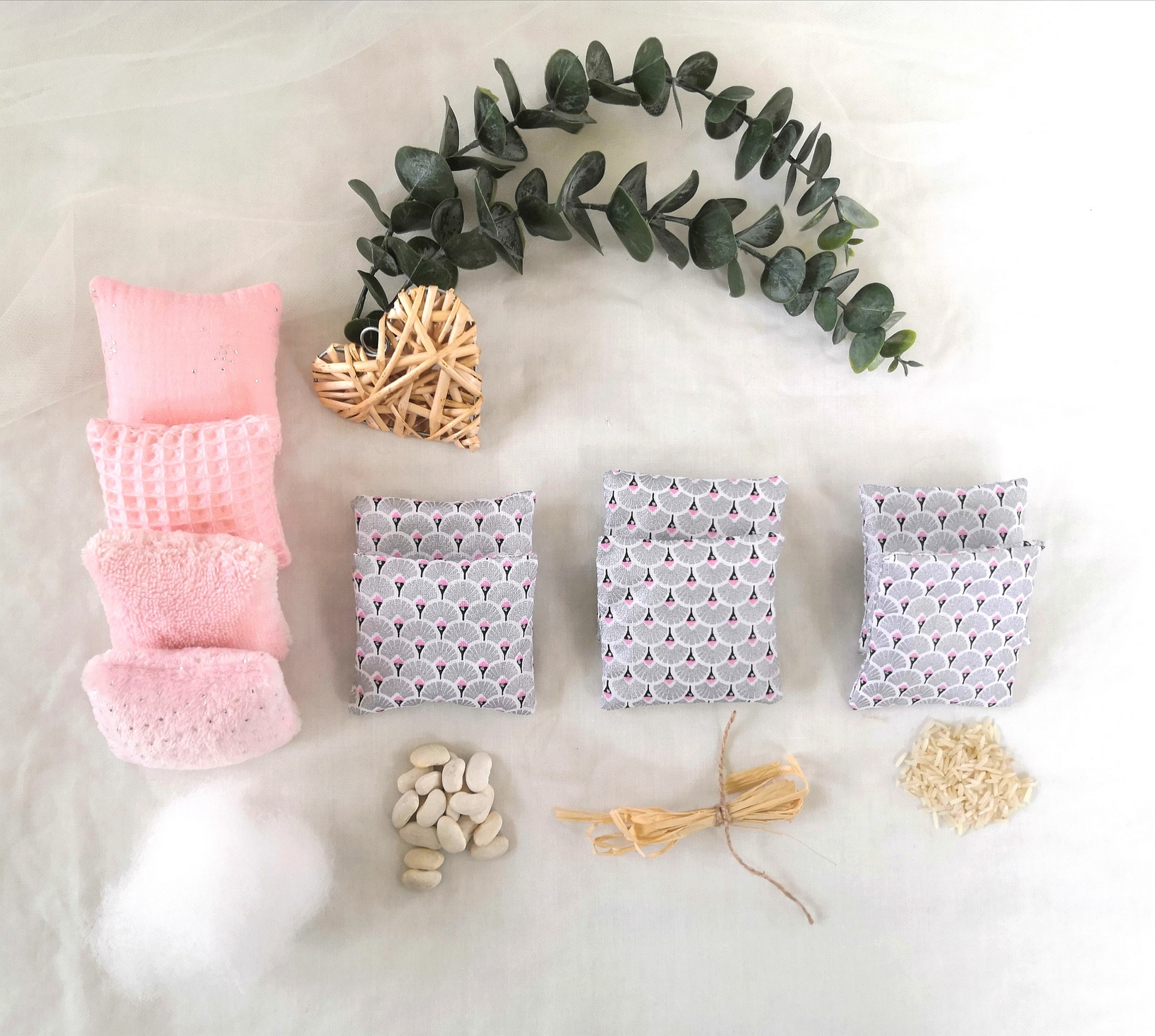 – 3 paires de coussins d’un même tissu mais avec un rembourrage différent : haricot blanc bio, raphia, riz bio.