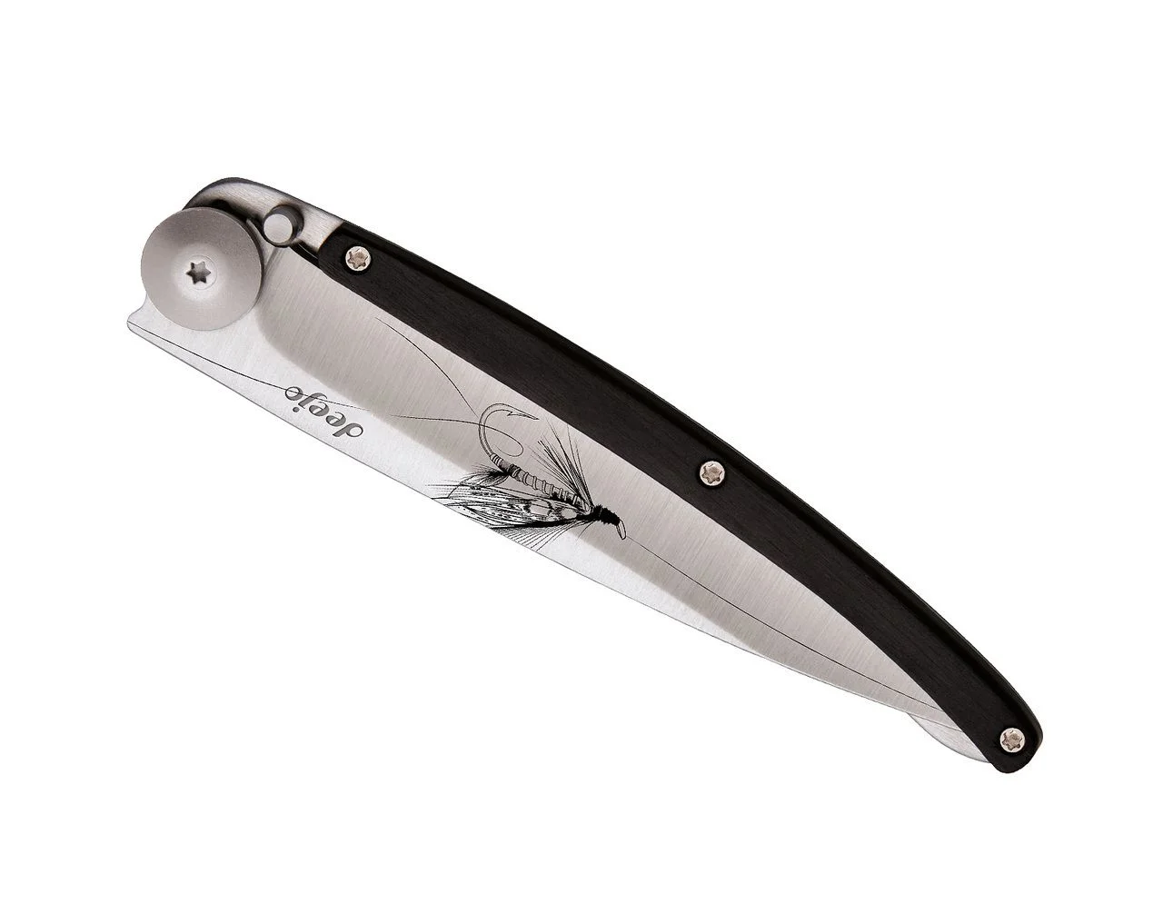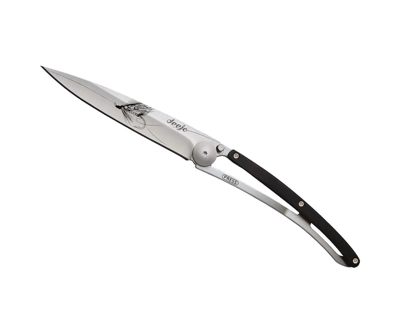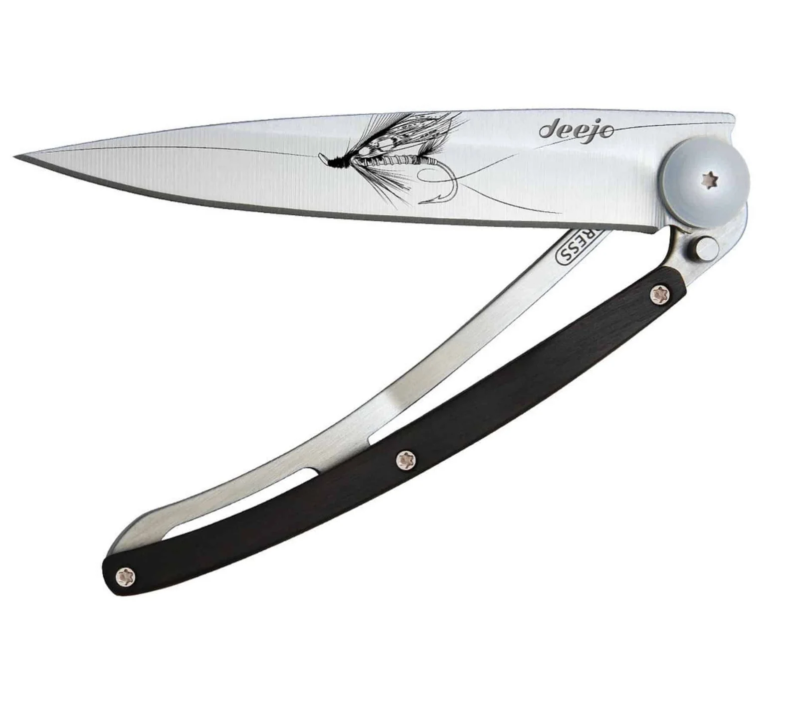 Couteau de Poche Bois D’Ebène Silver 37gr Wilkinson, Deejo. Un Deejo qui rend un bel hommage aux pêcheurs à la mouche, qui retrouveront en ce couteau une création originale et inattendue.
