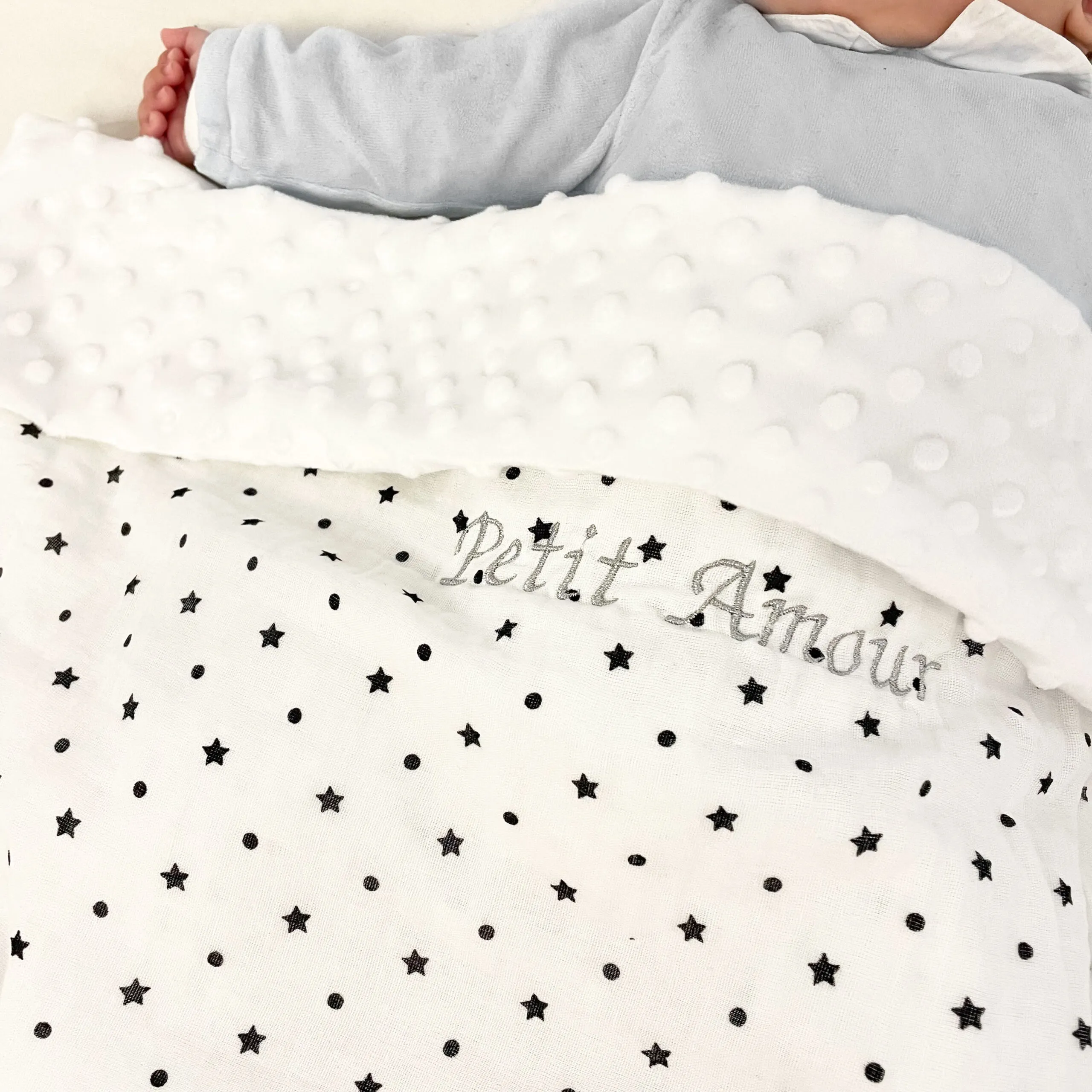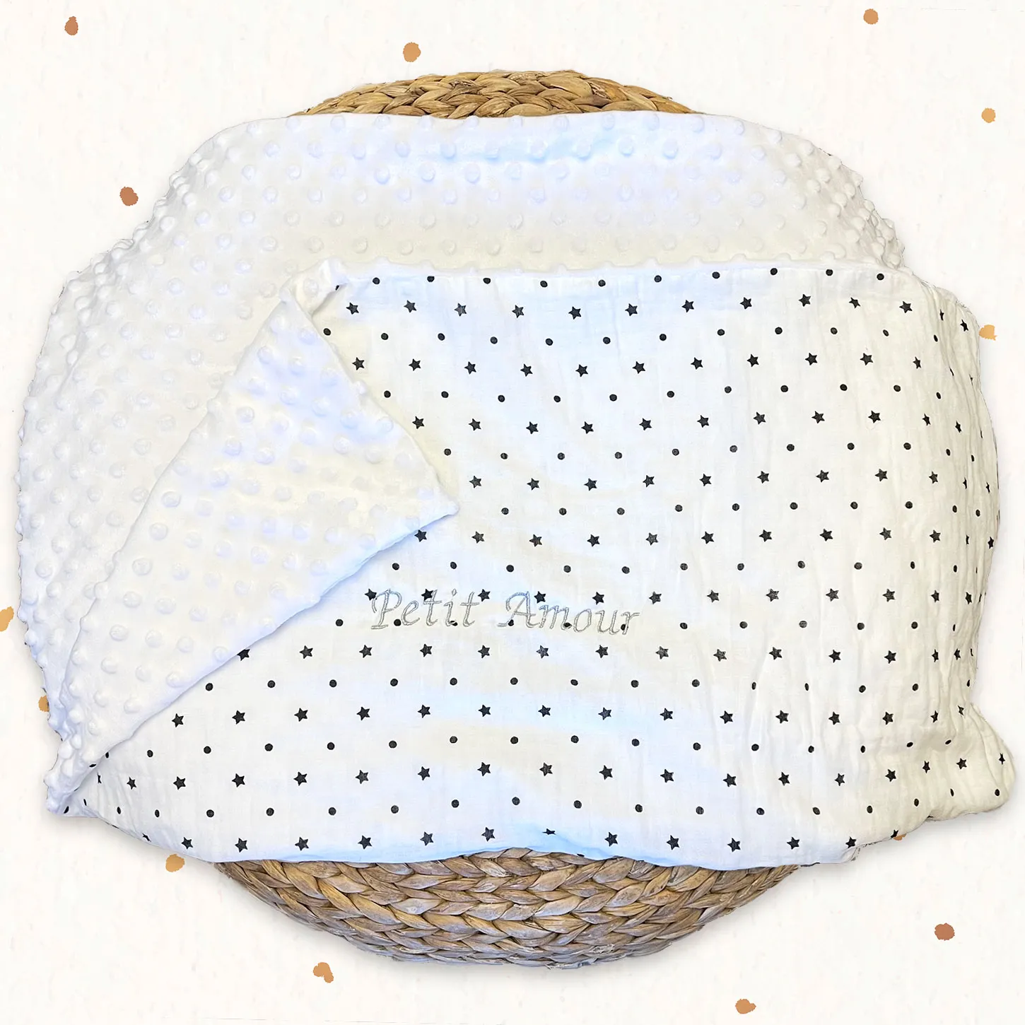 Couverture personnalisable gaze de coton à motifs étoiles et pois et minky polaire