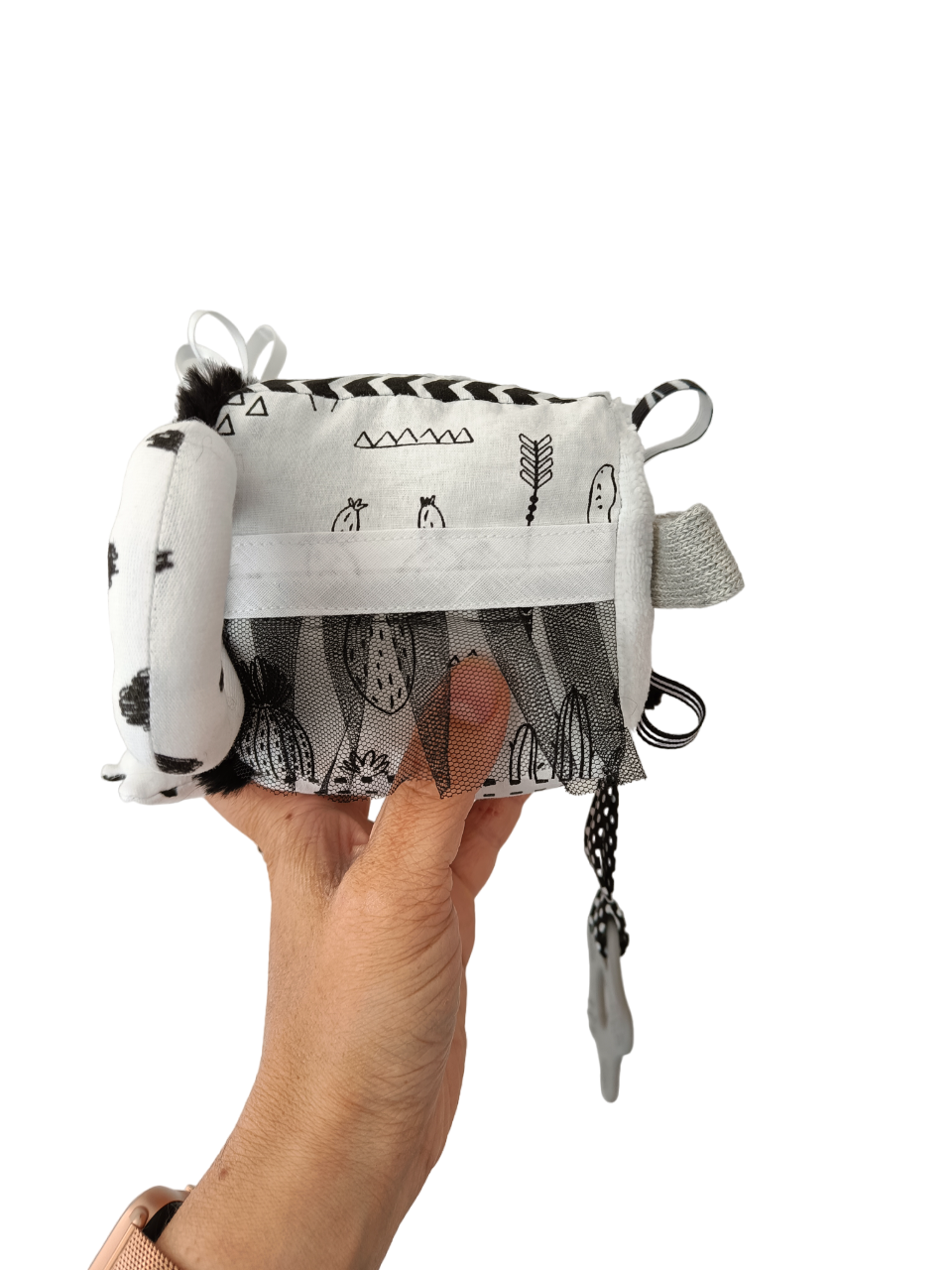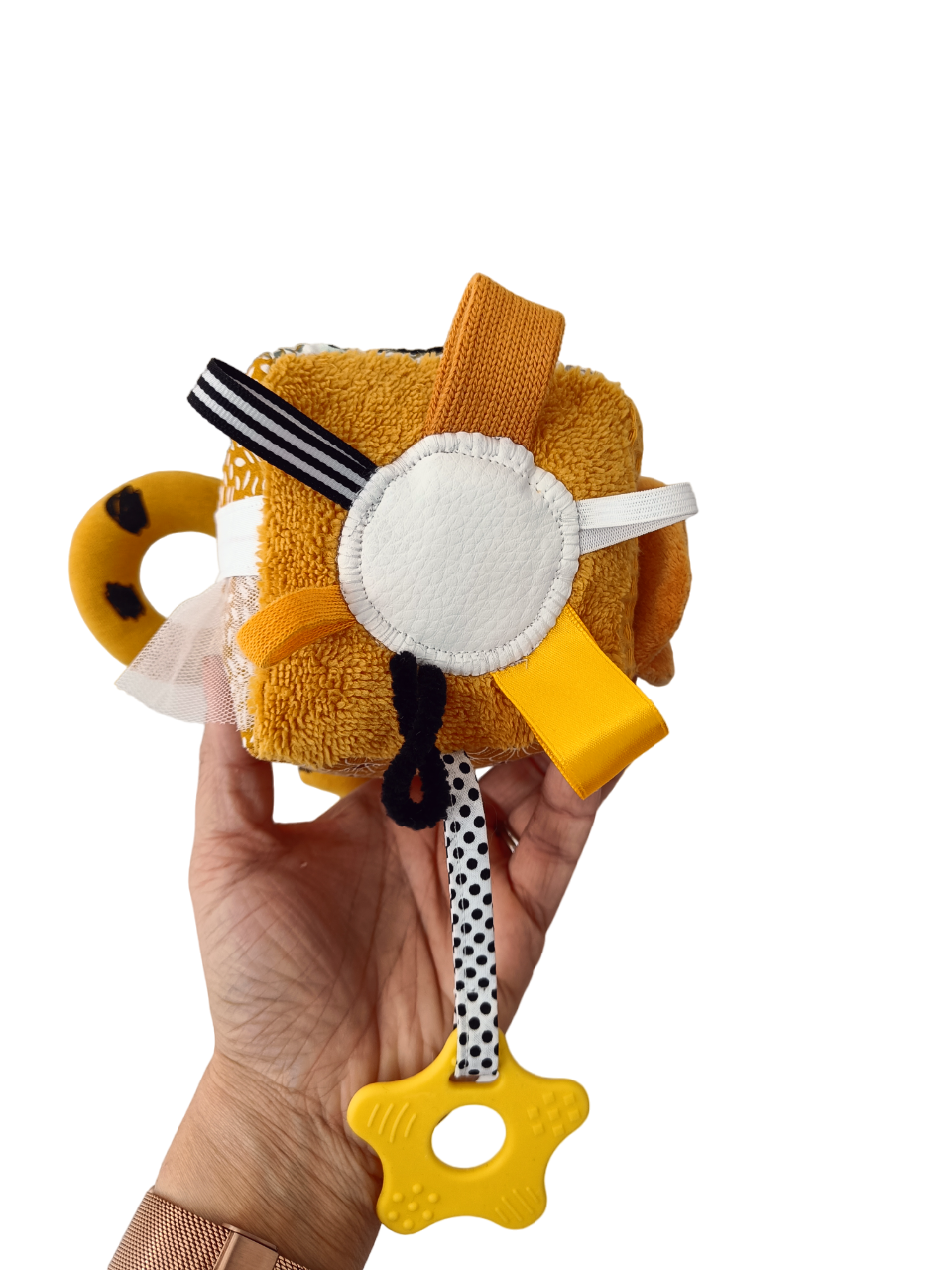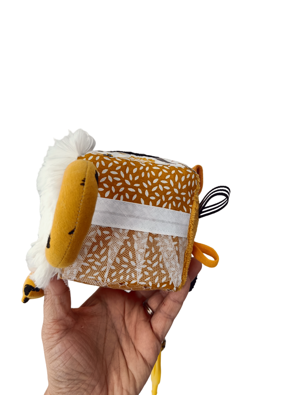 Le cube d’activité est très complet car tout y est pour émerveiller bébé afin d’éveiller ses sens avec des matières à toucher (coton, toile coton, nid d’abeille, tissu fourrure, éponge de bambou…) mais aussi des sons différents. Léger et avec un format idéal pour les petites mains, il promet donc de longues heures de jeu: