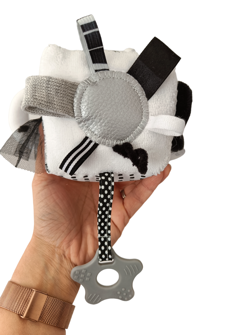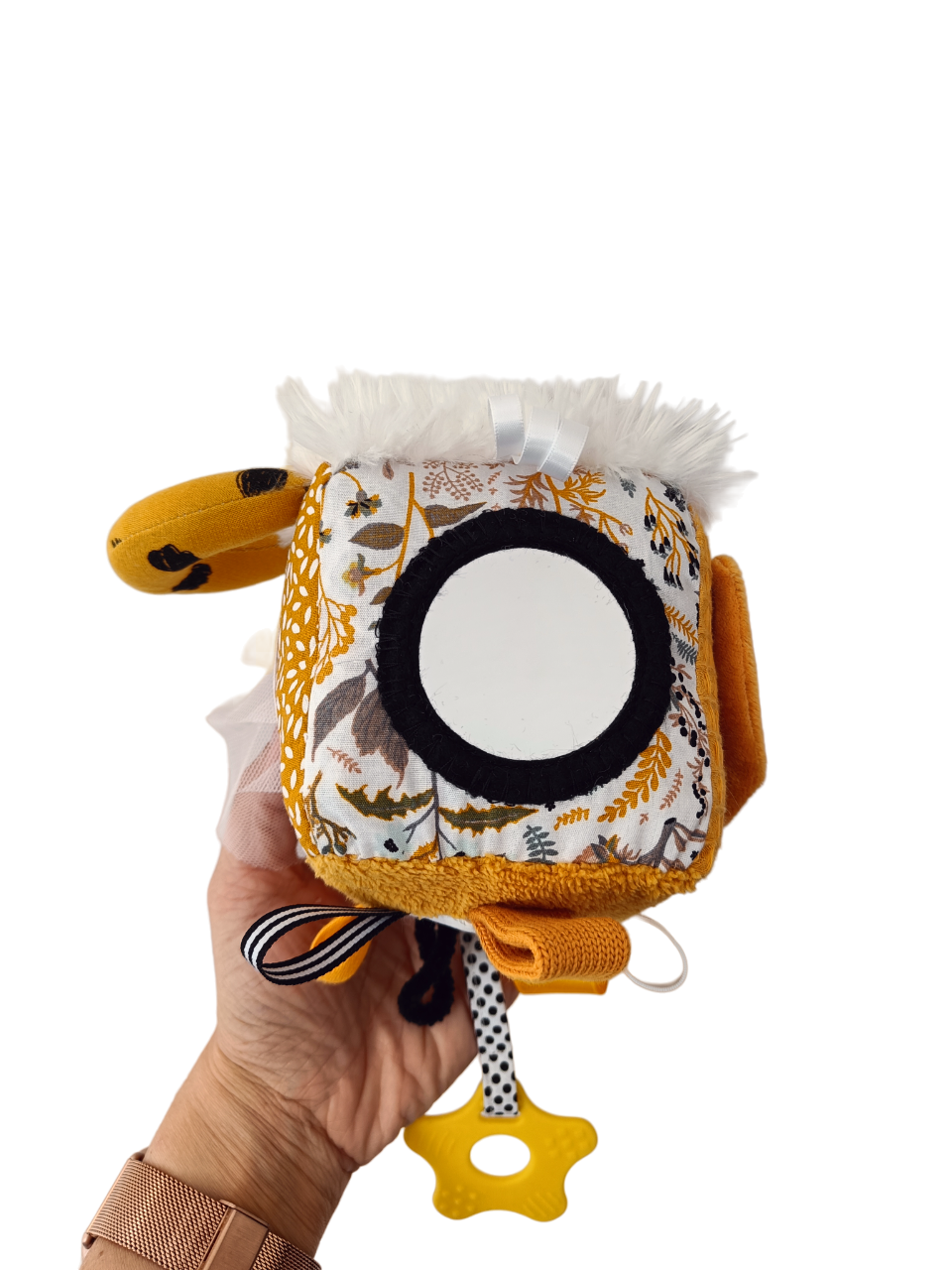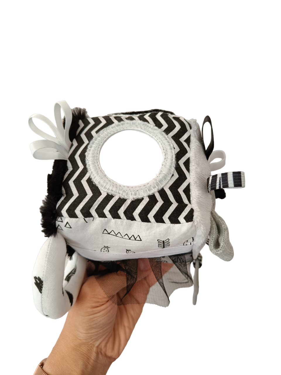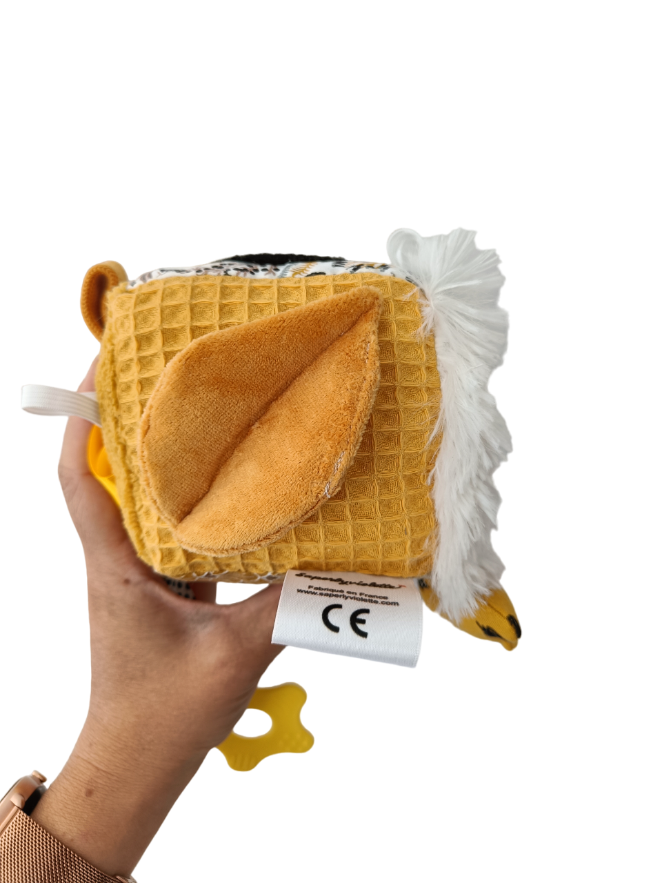 Le cube d’activité est très complet car tout y est pour émerveiller bébé afin d’éveiller ses sens avec des matières à toucher (coton, toile coton, nid d’abeille, tissu fourrure, éponge de bambou…) mais aussi des sons différents. Léger et avec un format idéal pour les petites mains, il promet donc de longues heures de jeu: