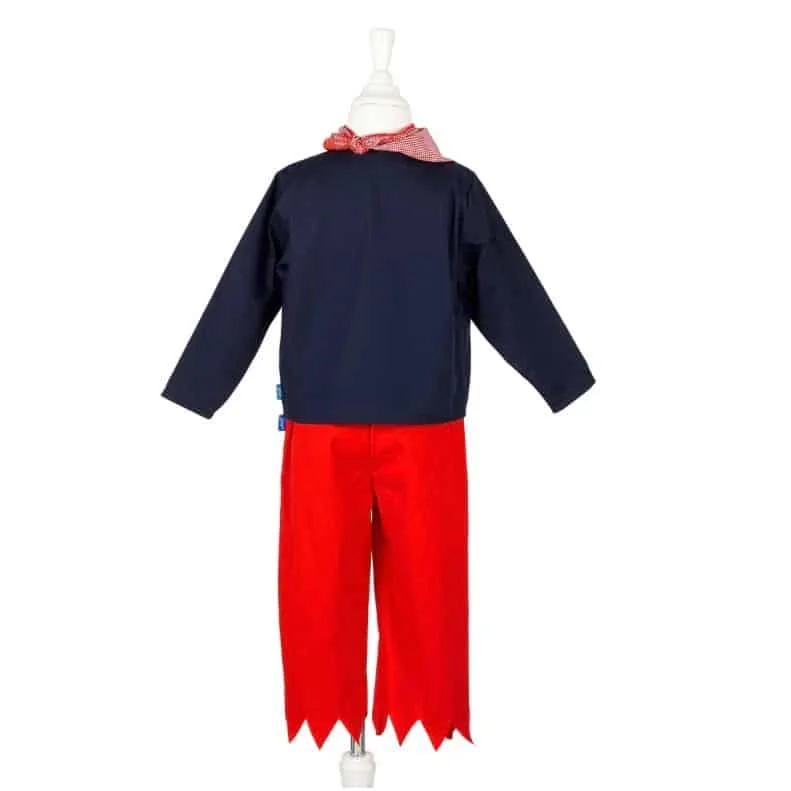Costume Pirate Robert pour enfants de 3 à 4 ans. Ensemble en coton rouge, bleu marine et doré avec pantalon 48 cm. Déguisement idéal pour les apprentis pirates en quête d’aventure !