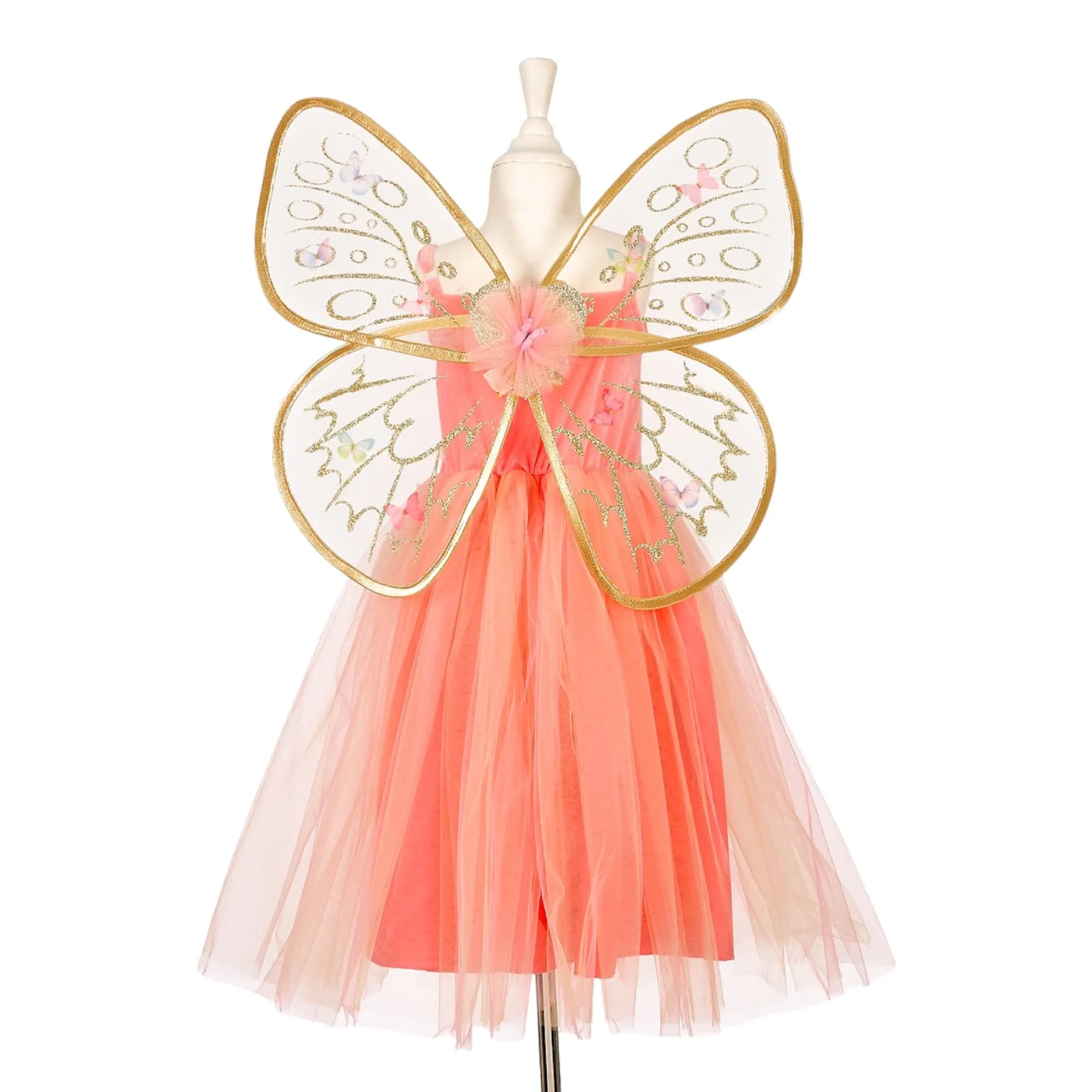 C’est une tenue splendide que votre fille appréciera porter à la maison ou lors d’un goûter d’anniversaire. La robe présente des sequins étincelants à l’avant et un dos en velours extensible. Sur le devant de la robe, vous trouverez du tulle agrémenté de papillons, et une paire d’ailes dorées à porter dans le dos pour se transformer en une véritable fée.