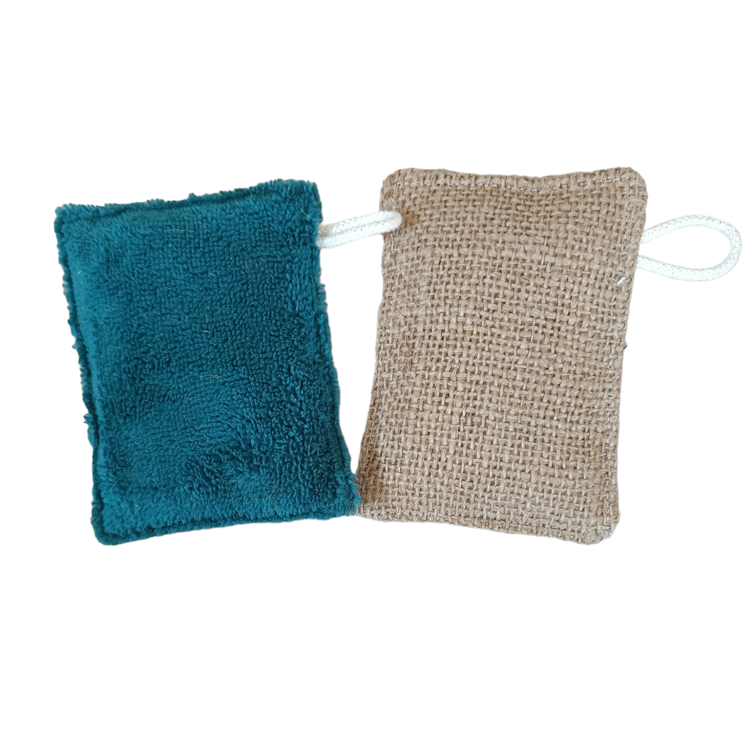 Duo d’éponges lavables assorties. Une éponge en micro-éponge de bambou (pour la vaisselle peu sale, le plan de travail et ménage quotidien) et une en toile de jute pour désincruster les traces tenaces. La face en coton est identique sur les 2 éponges.