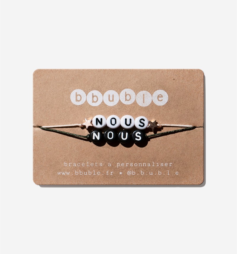 2 bracelets NOUS: l’un à garder pour soi, l’autre à offrir. Pour elle, les perles sont blanches, les étoiles « or rose » et le cordon poudre. Pour lui, les perles sont noires, le cordon kaki Le bracelet ferme et s’ajuste grâce à 2 nœuds coulissants.