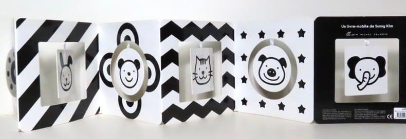 Ce petit livre cartonné, à déplier en accordéon, a été pensé pour stimuler les bébés dans leurs premiers progrès. Ses pages comportent des parties mobiles attachées par des rubans qui captent l’attention de l’enfant et focalisent sa concentration. Le graphisme en noir et blanc – des figures géométriques simples, des motifs et des animaux – est parfaitement adapté à la vision des nouveau-nés, qui ne distinguent pas encore les couleurs mais perçoivent les nuances de tonalités pâles et foncées. Dès la naissance