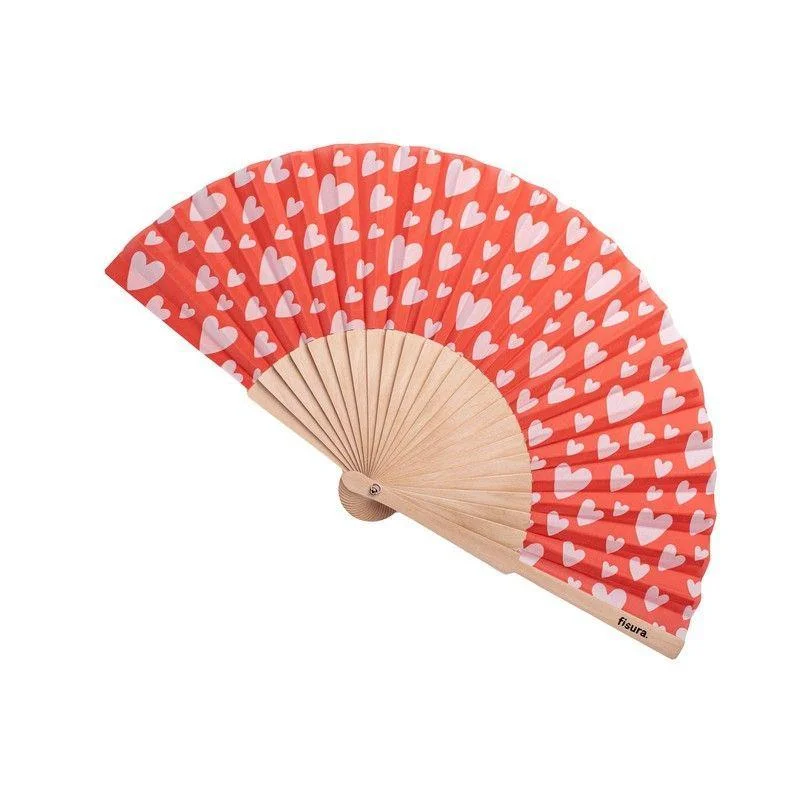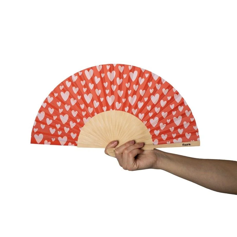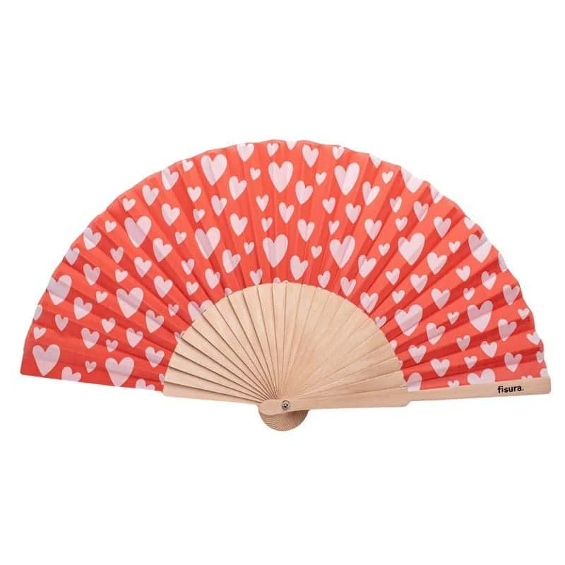 Eventail Cœurs, Fisura. Un éventail en tissu et en bois avec un motif de cœurs rouges, brillant dans l’obscurité. Livré avec une attache pour suspendre et emballé individuellement avec le même design que l’éventail.
