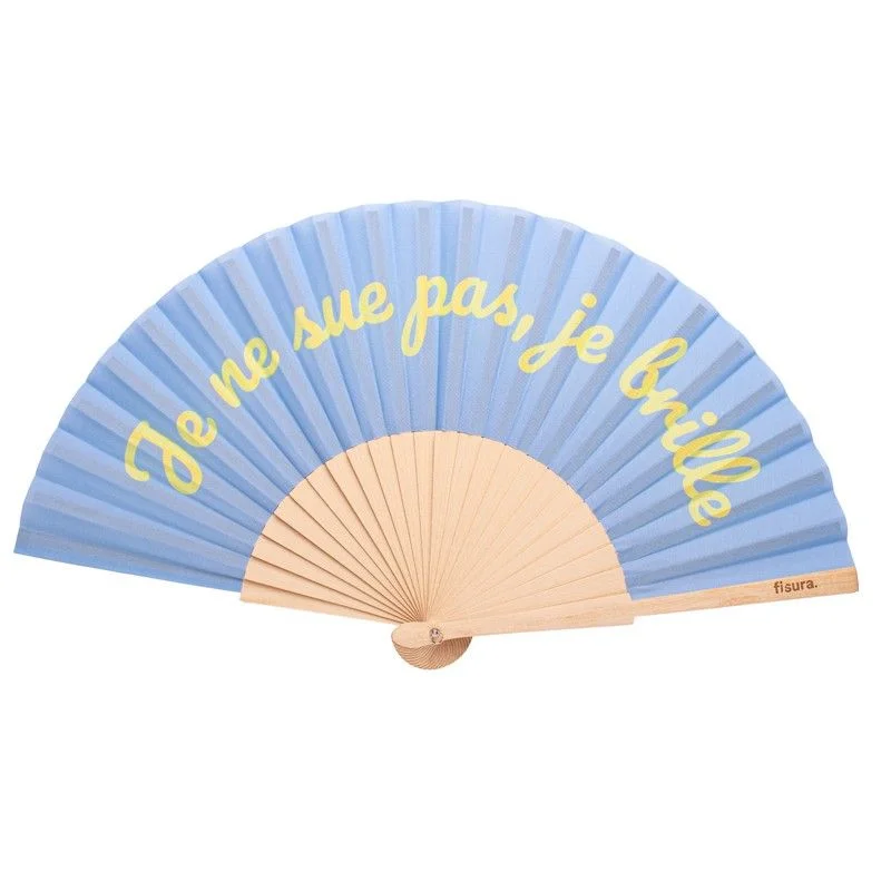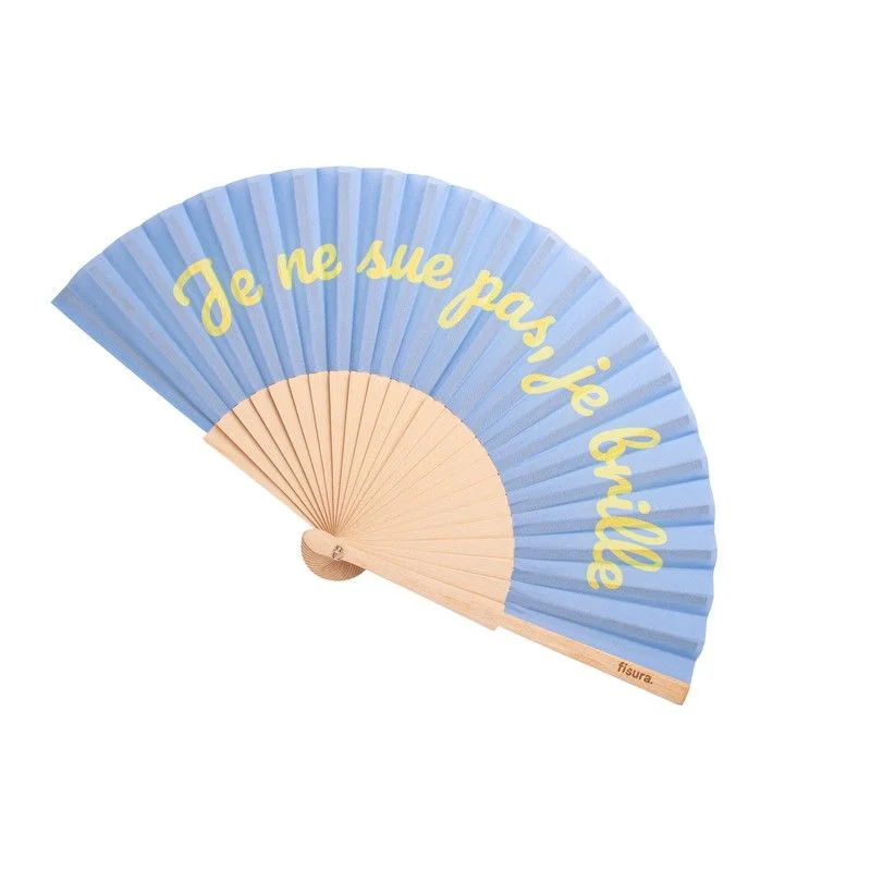 Eventail Je ne Sue Pas, Je Brille, Fisura. Un éventail en tissu et en bois avec un motif d’impression Je ne Sue Pas, Je Brille. Livré avec une attache pour suspendre et emballé individuellement avec le même design que l’éventail.