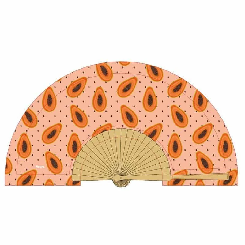 Eventail Papaye Fisura. Un éventail en tissu et en bois avec un motif d’impression Papaye. Livré avec une attache pour suspendre et emballé individuellement avec le même design que l’éventail.