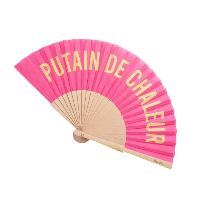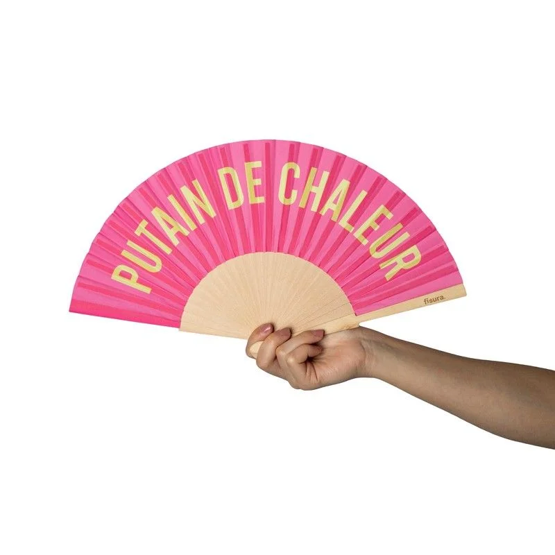Un éventail en tissu et en bois avec un motif d’impression « Putain de Chaleur »!!