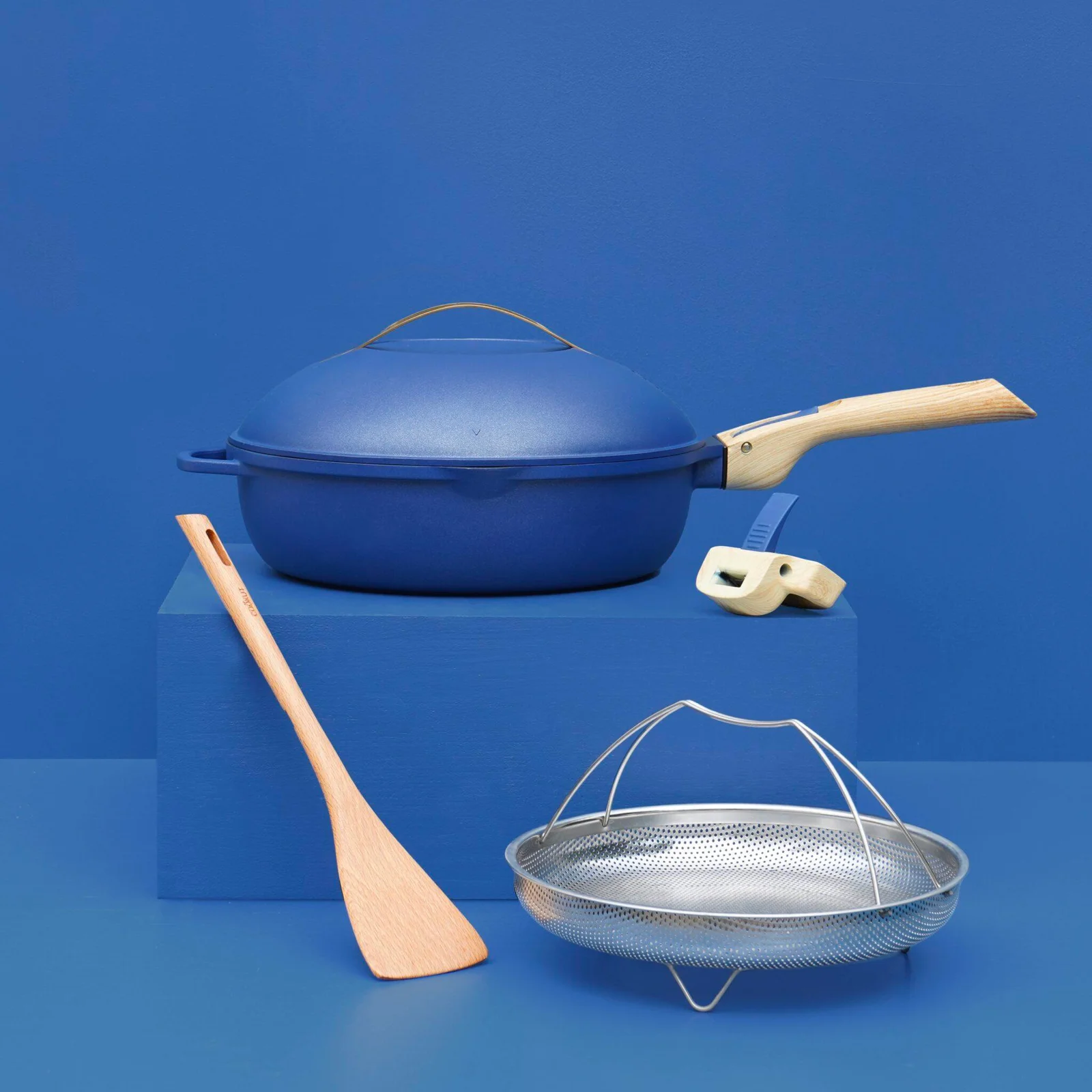 - Le set comprend également 2 poignées détachables (une longue et une courte) pour une manipulation aisée, un panier vapeur pour cuire vos légumes de manière saine et un indispensable spatule en bois.