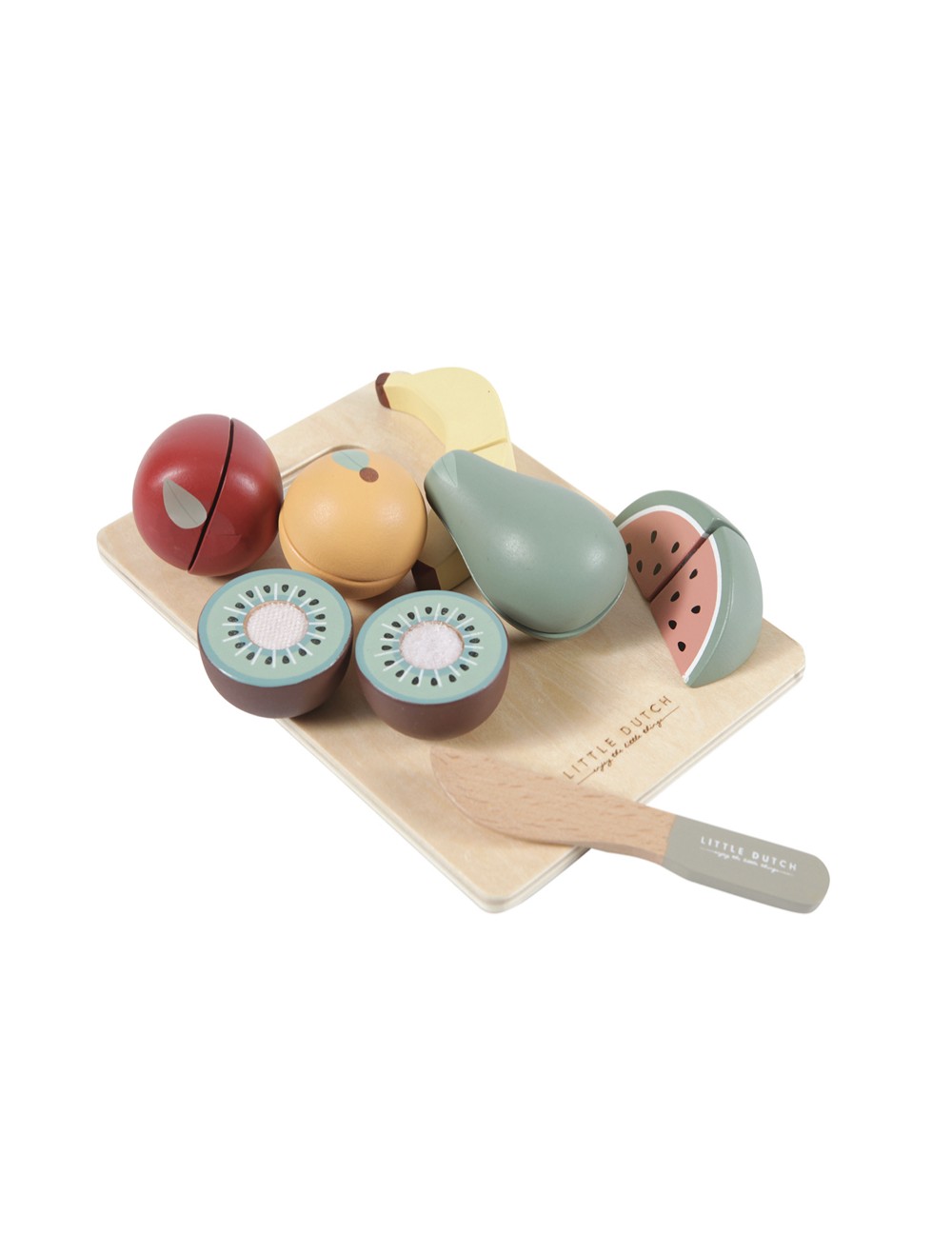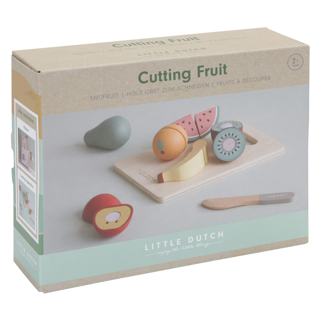 Mangez cinq fruits et légumes par jour ! Votre enfant adorera vous imiter en préparant à manger avec ce joli set de 6 fruits différents. Une planche à découper et un couteau en bois sont fournis pour couper les fruits en deux et découvrir ce qui se cache à l’intérieur. Pomme, banane, kiwi, poire, orange ou pastèque : vous n’avez que l’embarras du choix ! Tous les fruits se recollent facilement à l’aide du scratch.