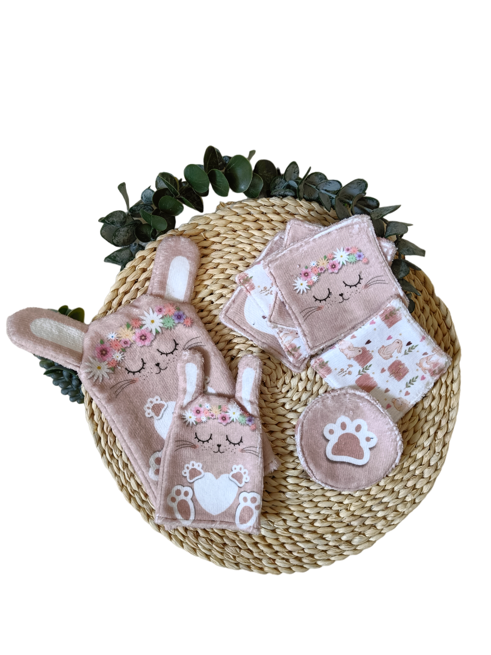 Gant de toilette et cotons réutilisables modèle lapin.