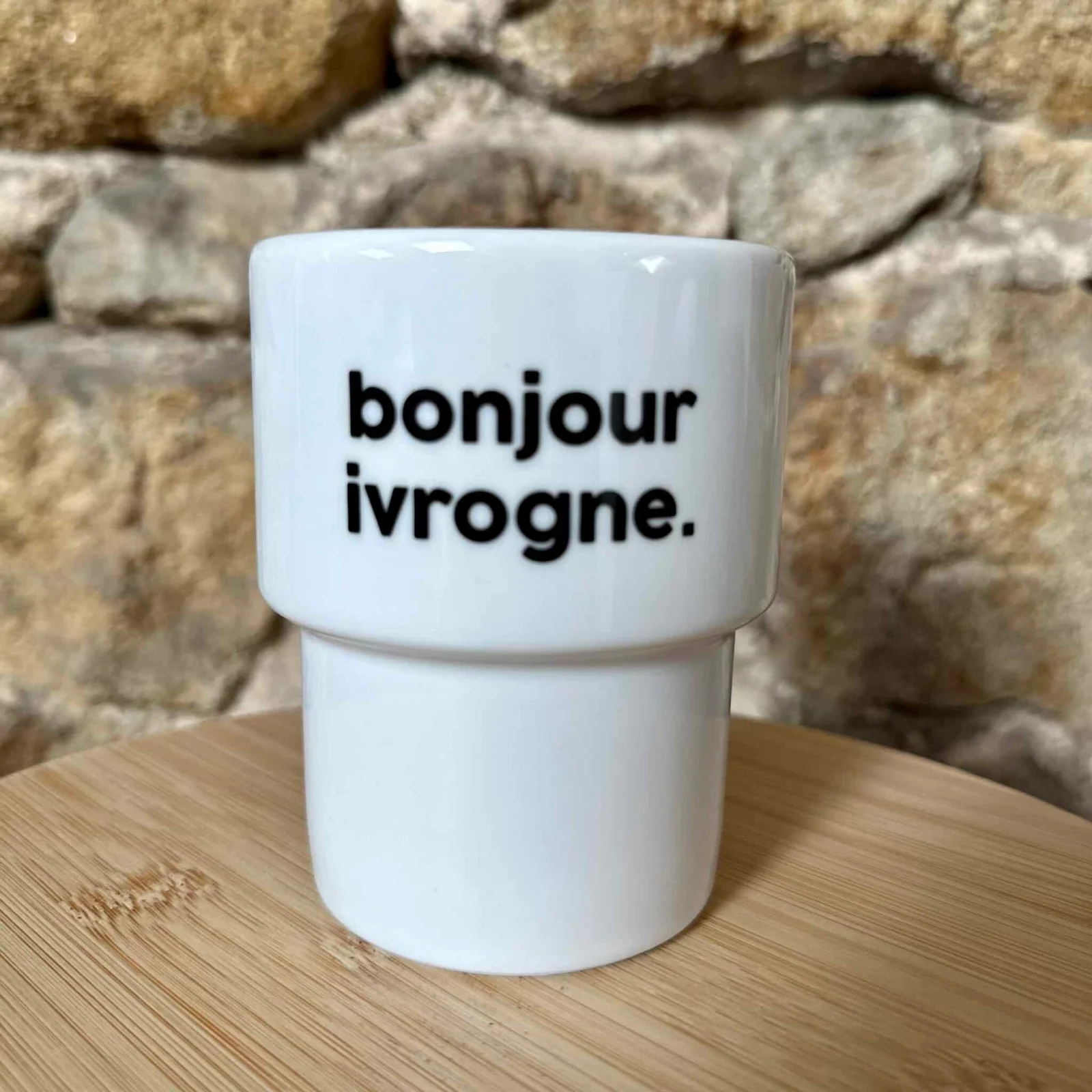 Gobelet Bonjour Ivrogne, Félicie Aussi. Gobelet empilable en porcelaine signé Félicie Aussi décoré d’un message ludique et plein d’humour. Entre petits noms doux et tendres injures, trouvez le gobelet idéal (ou pas) pour vos proches !