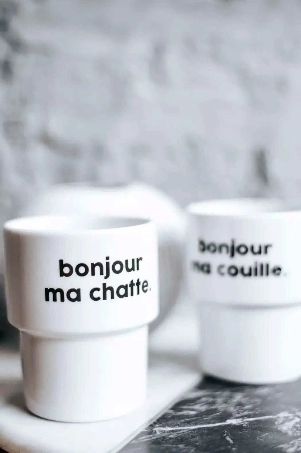 Gobelet Bonjour Ma Chatte, Félicie Aussi. Gobelet empilable en porcelaine signé Félicie Aussi décoré d’un message ludique et plein d’humour. Entre petits noms doux et tendres injures, trouvez le gobelet idéal (ou pas) pour vos proches !