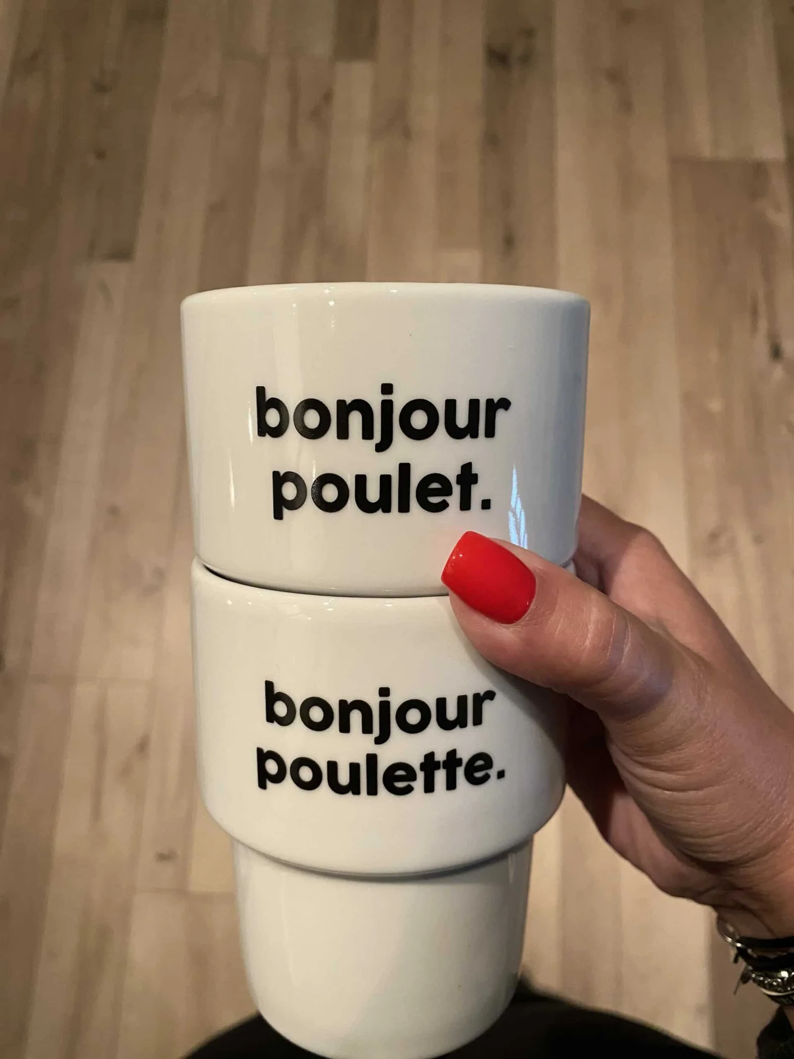 Gobelet Bonjour Poulet Félicie Aussi. Gobelet empilable en porcelaine signé Félicie Aussi décoré d’un message ludique et plein d’humour. Entre petits noms doux et tendres injures, trouvez le gobelet idéal (ou pas) pour vos proches !
