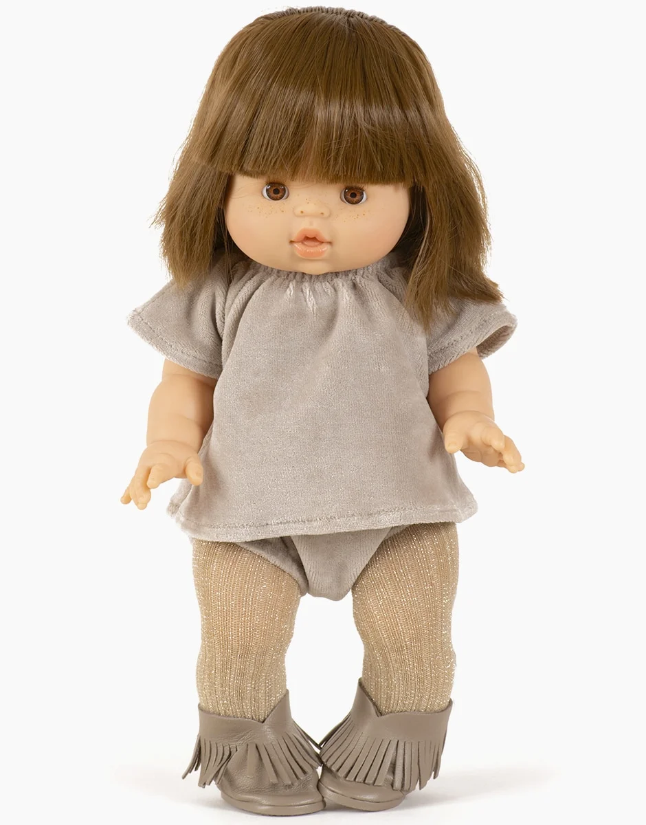 Offrez un look chic et cosy à votre poupée Minikane avec cet élégant ensemble top Mazarine et culotte Charlotte en velours Nikky. Ce vêtement est conçu pour les poupées Gordis de 34 et 37 cm.