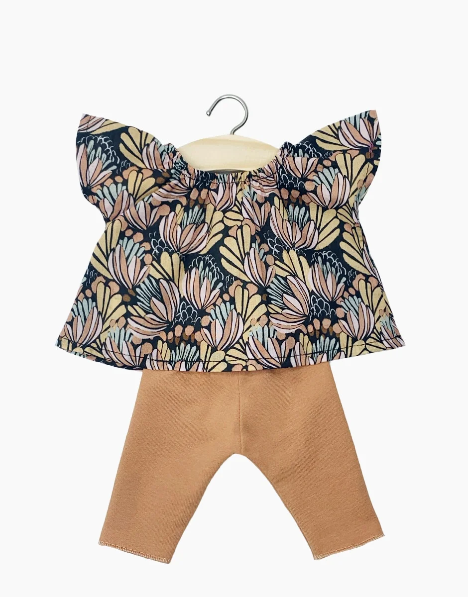 Ensemble Mazarine top Fleurs d’eau et legging en jersey cassonade pour poupées Minikane Gordis 34 & 37cm.