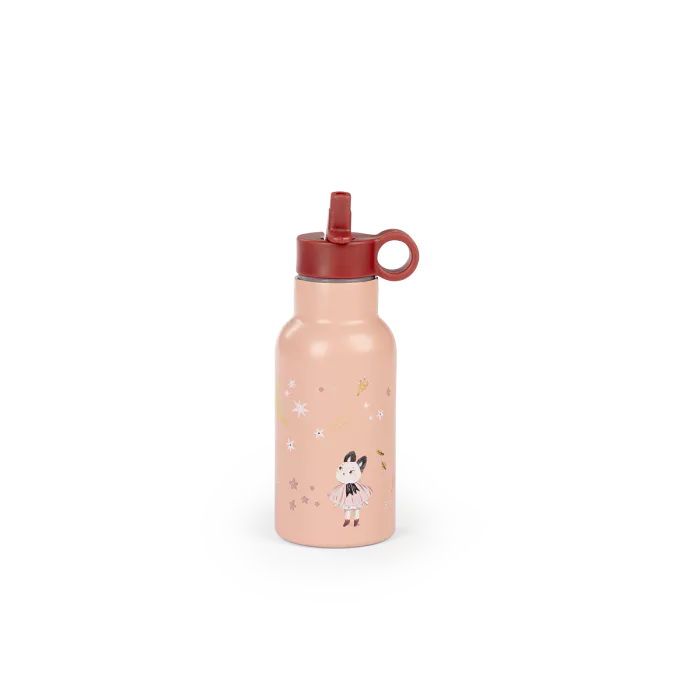 Gourde compacte illustrée – Collection Après la pluie. En inox avec bouchon plastique et mousqueton. Dimensions : 6,5 x 17,5 cm. Lavage à la main. Dès 3 ans.