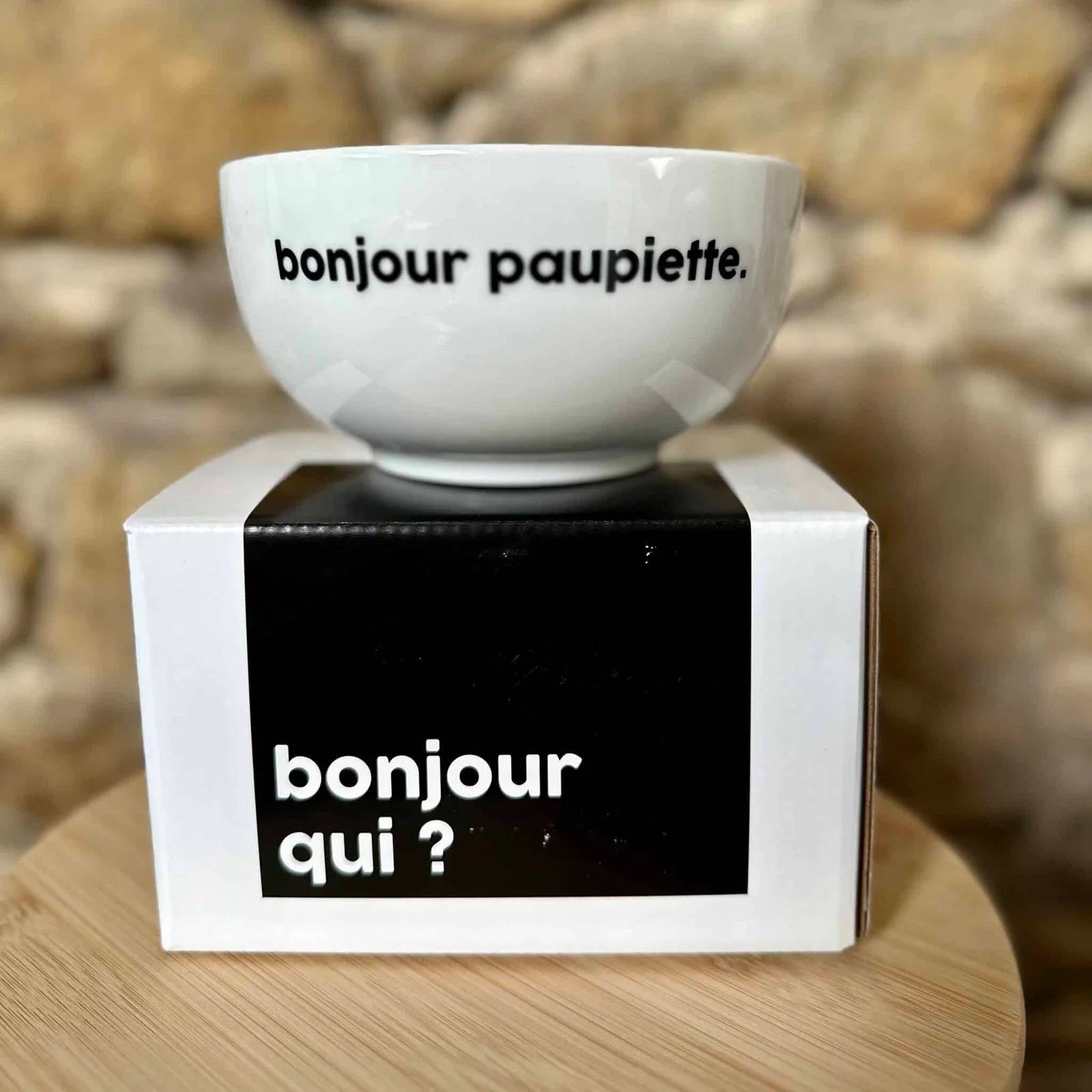 Grand Bol Bonjour Paupiette, Félicie Aussi. Grand bol en porcelaine signé Félicie Aussi décoré d’un message ludique et plein d’humour. Entre petits mots doux et tendres injures, trouvez le bol idéal (ou pas) pour vos proches !
