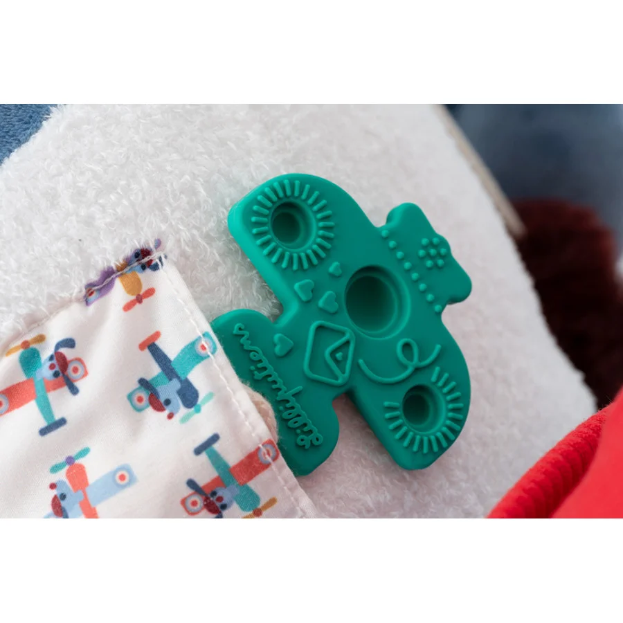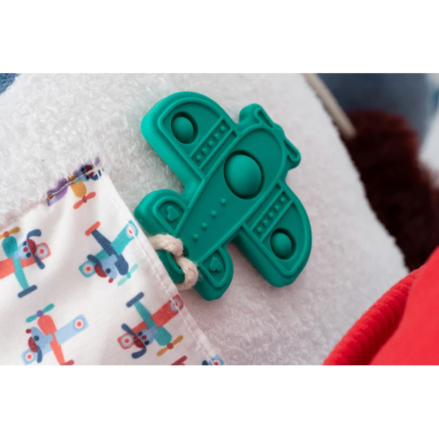 Un anneau de dentition en silicone, détachable, avec fonction popping pour soulager les gencives.