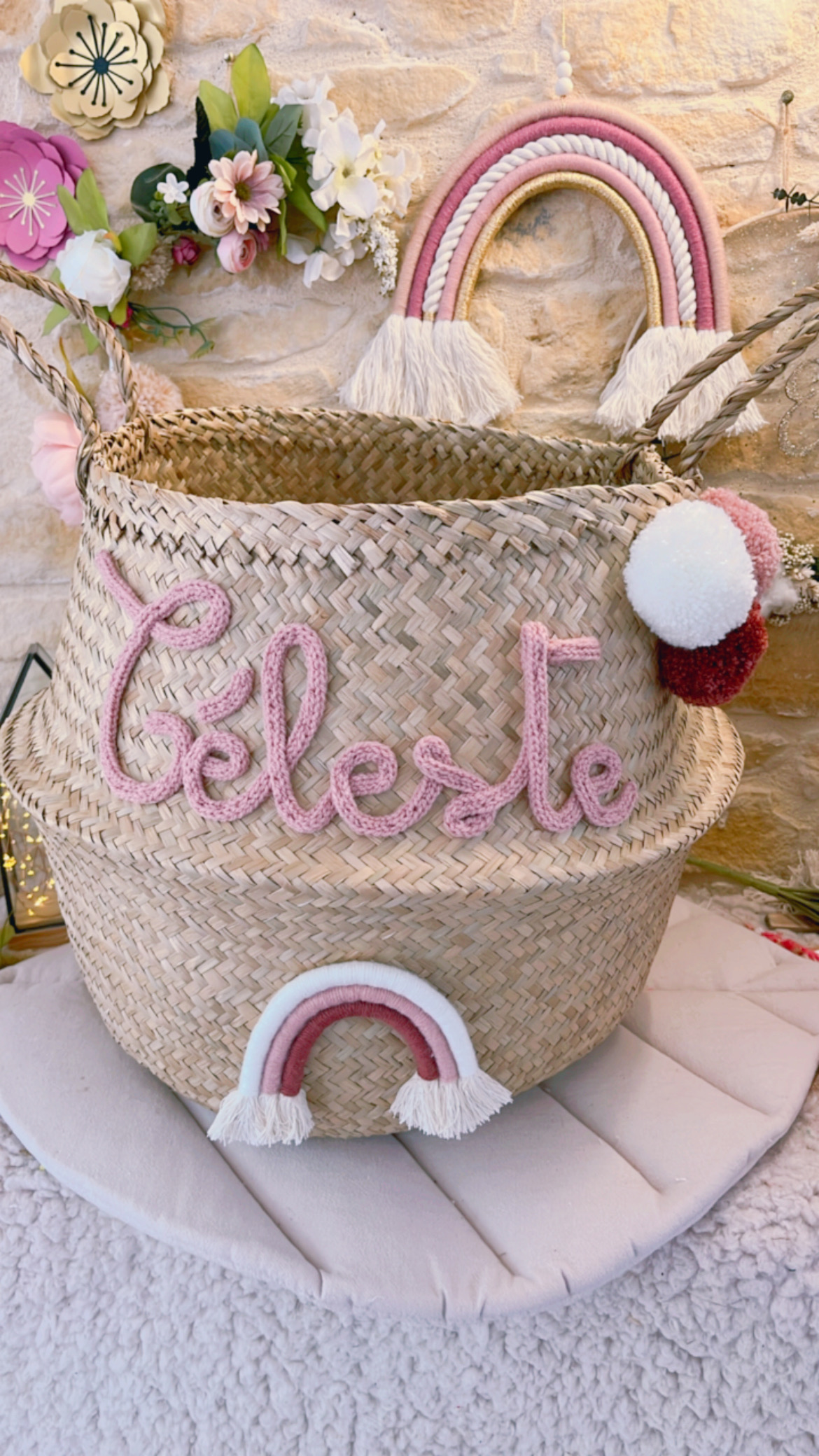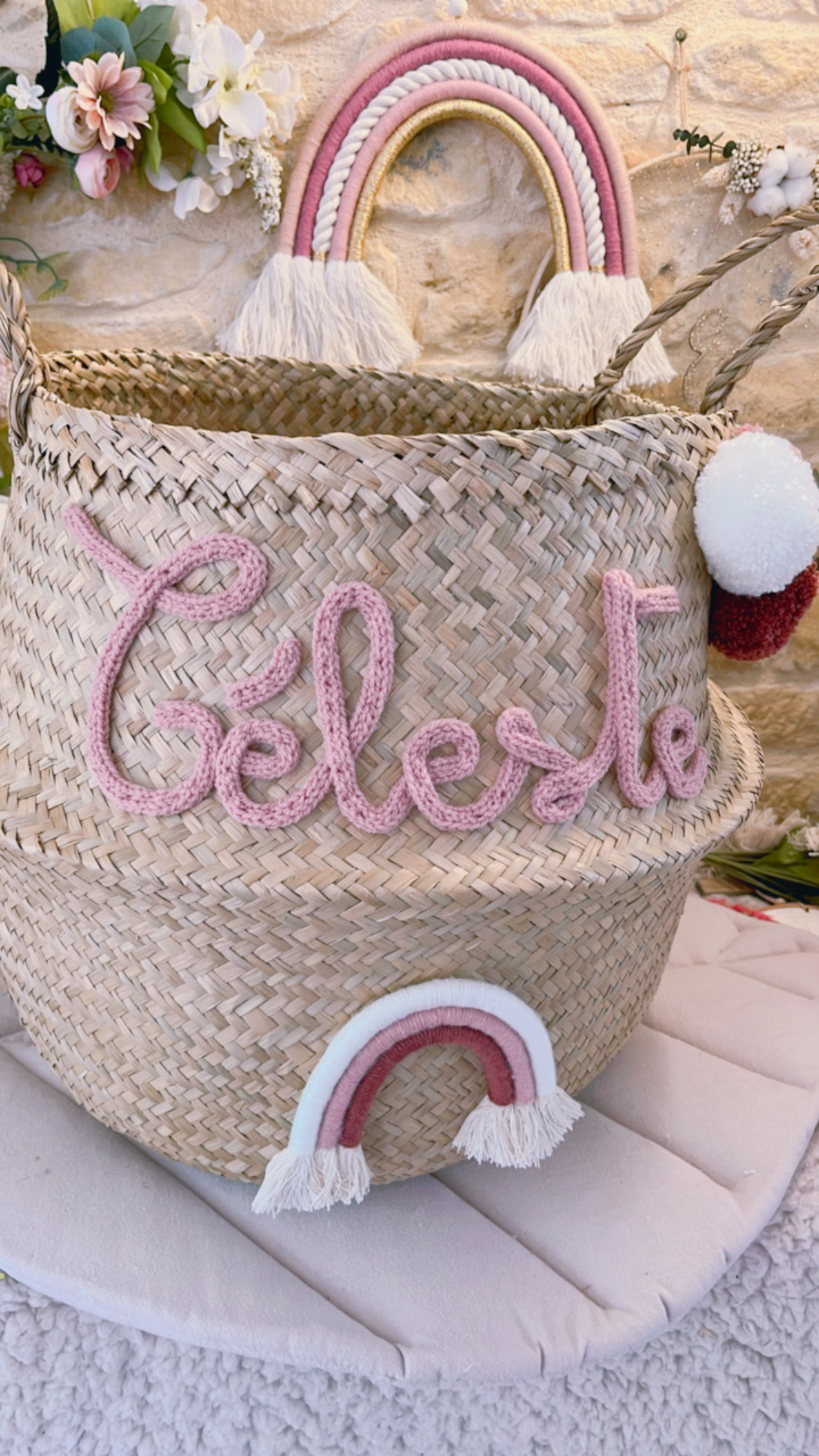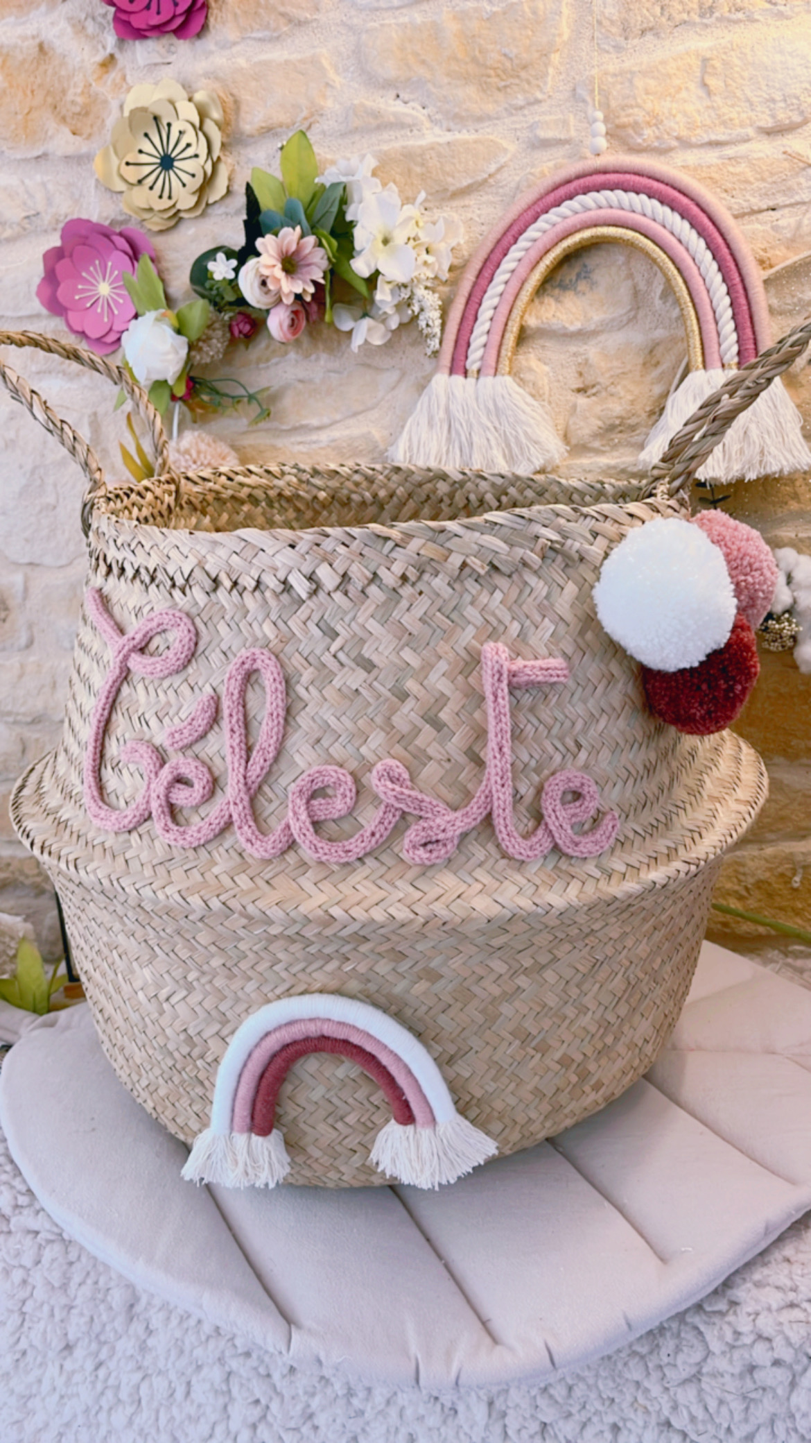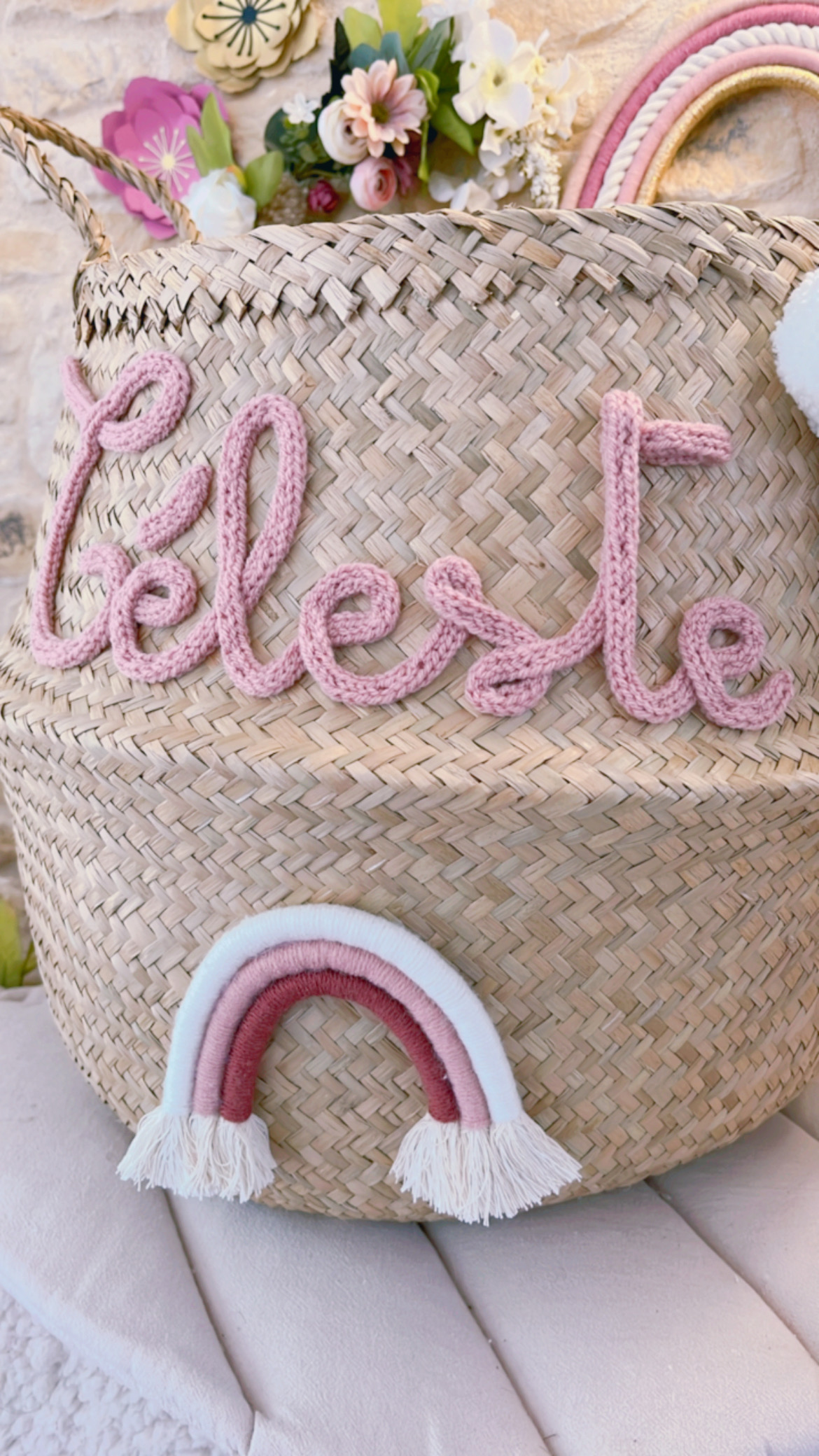 Grand panier à jouets tressé Arc-en-ciel en macramé avec pompons Grand panier à jouets en feuille de palmier tressé souple et léger qui peut se plier sur lui-même. Idéal pour une chambre d’enfant ou une salle de jeu. Dimensions 38cm de haut, 45cm diamètre au plus large et 36cm de diamètre au plus haut. Prénom, […]