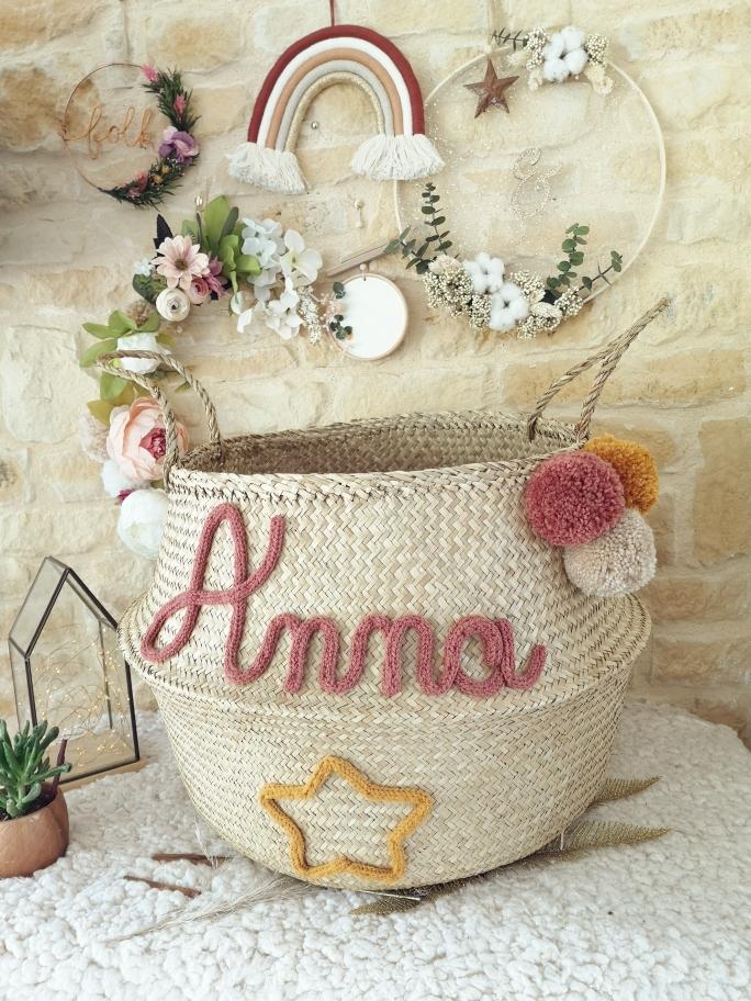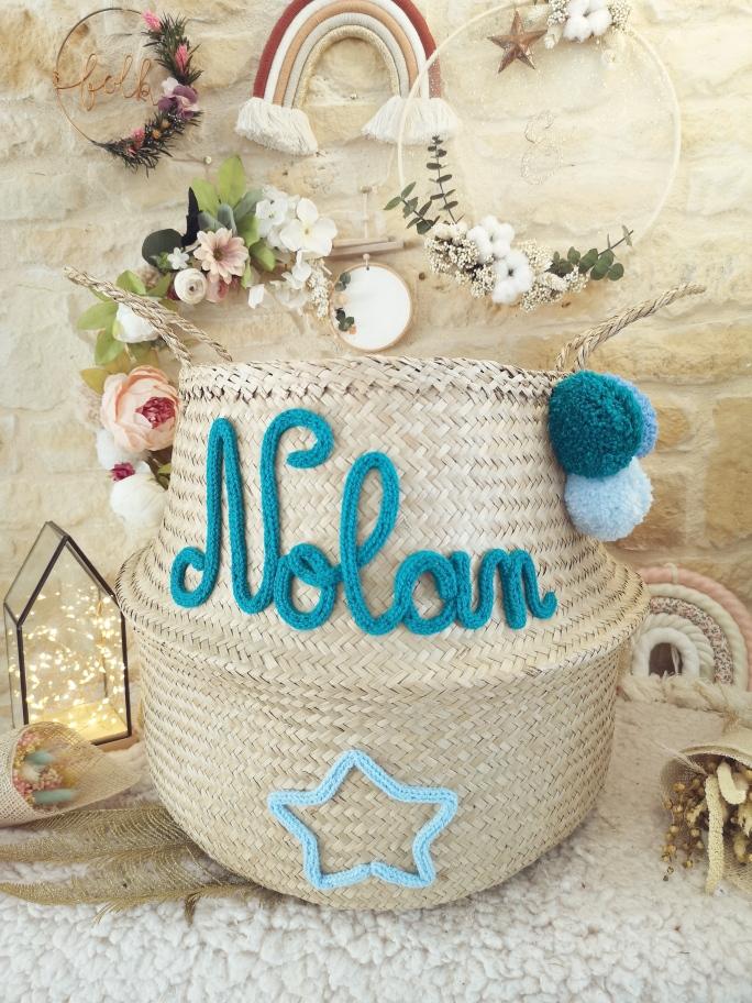 Grand Panier à jouets tressé étoile avec pompons Grand panier à jouets en feuille de palmier tressé souple et léger qui peut se plier sur lui-même. Idéal pour une chambre d’enfant ou une salle de jeu. Dimensions 38cm de haut, 45cm diamètre au plus large et 36cm de diamètre au plus haut. Prénom, étoile et […]