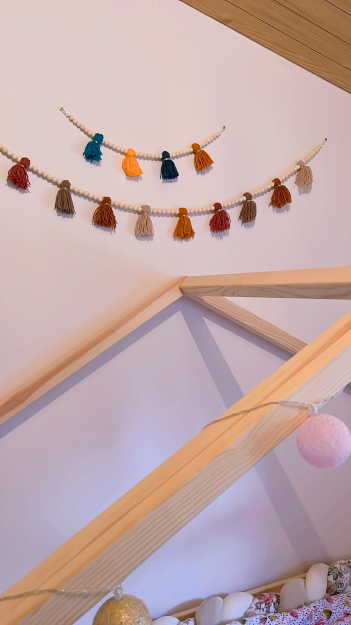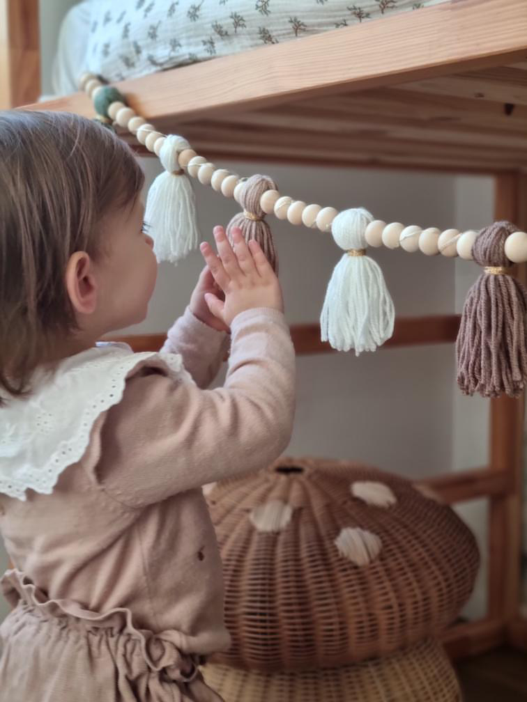 Grande guirlande en perles bois, laine et corde. Se compose de 10 pompons.