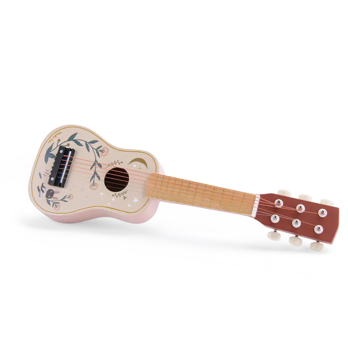 Guitare Après la Pluie, Moulin Roty. Offrez à votre petit musicien en herbe une guitare en bois décorée des illustrations poétiques de la collection Après la pluie, équipée de 6 cordes en métal pour une expérience authentique.