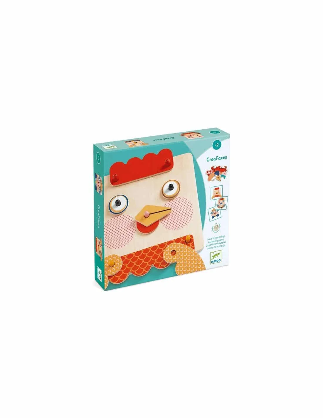 CreaFaces est un jeu d’assemblage et de manipulation à partir de 2 ans. L’enfant reproduit des animaux en s’aidant des cartes modèles et en positionnant les pièces en bois sur la planche. En utilisant les pièces des lapins, chien, cochon et poule, il peut s’amuser à inventer d’autres animaux encore plus farfelus !