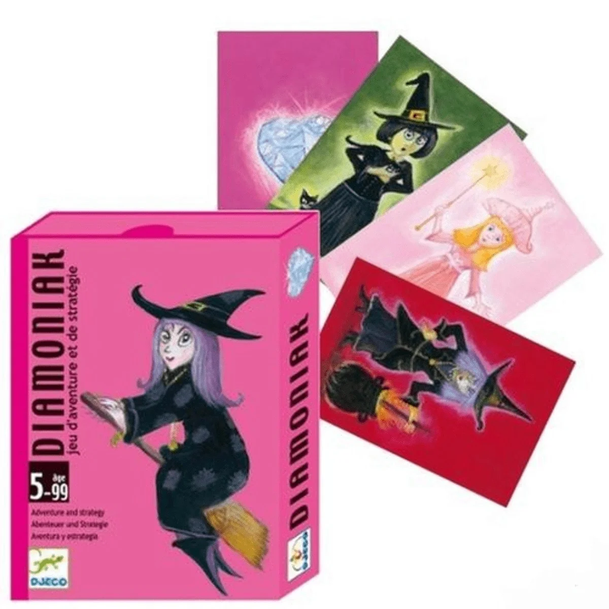 Diamoniak de Djeco est un jeu de cartes plein de rebondissements, idéal pour les enfants dès 5 ans (et jusqu’à 99 ans !). Le but ? Être la première à construire un château complet de 6 cartes de la même couleur. Mais attention : les sorcières ne sont jamais bien loin…