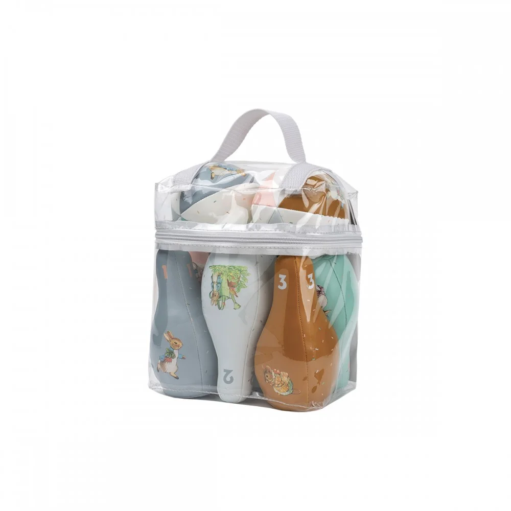 Jeu de quilles souples Pierre Lapin, avec 6 quilles illustrées et 2 balles, pour développer la motricité et s’amuser dès 12 mois. Fourni avec sac de transport.