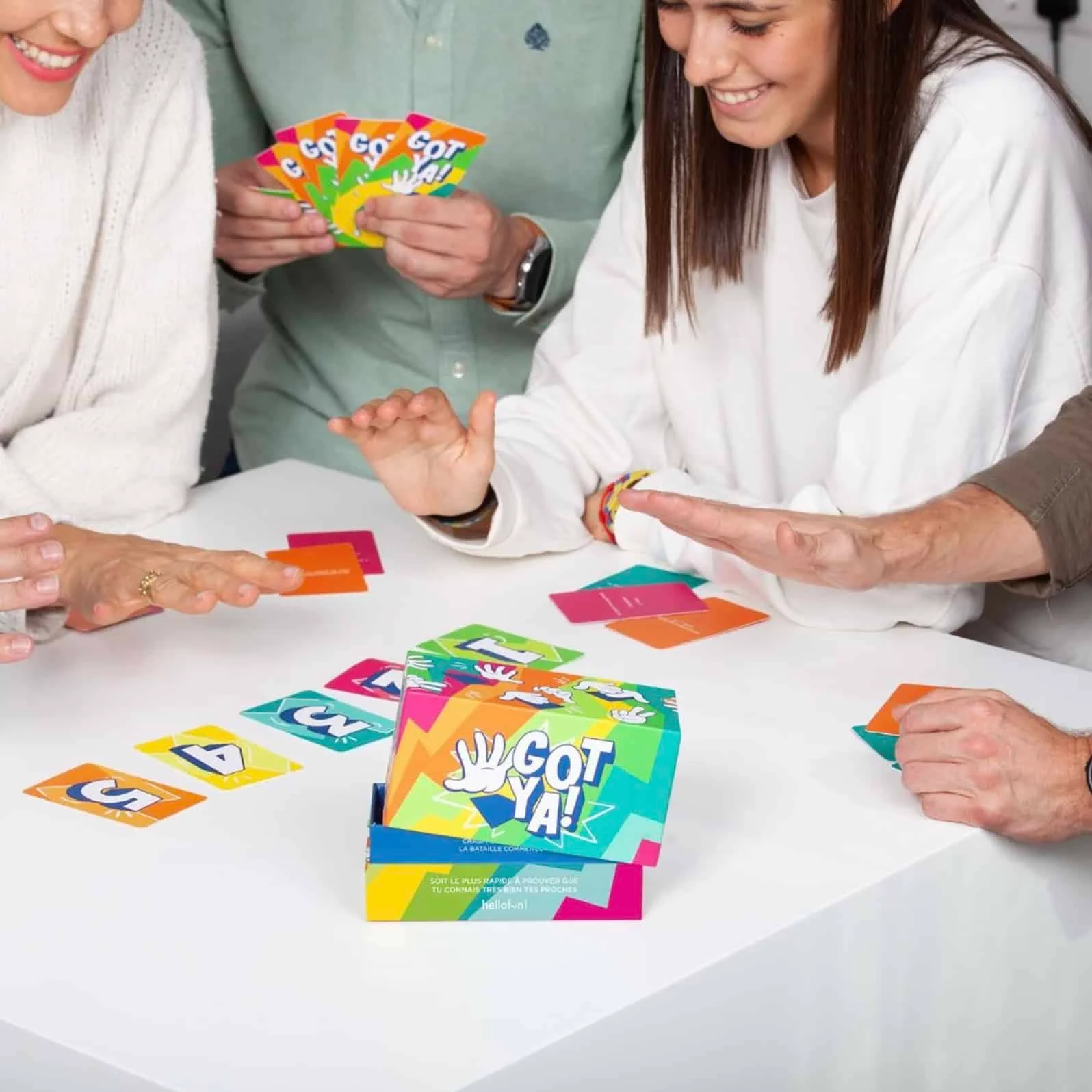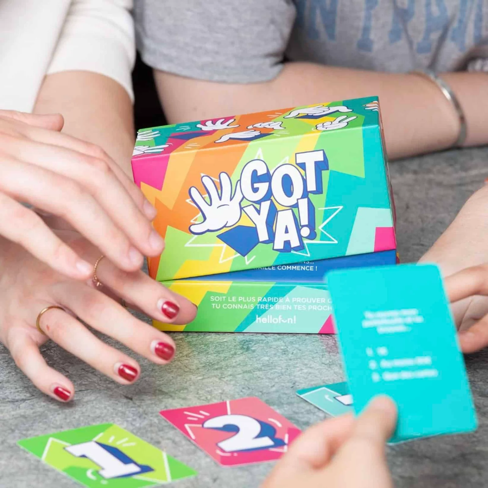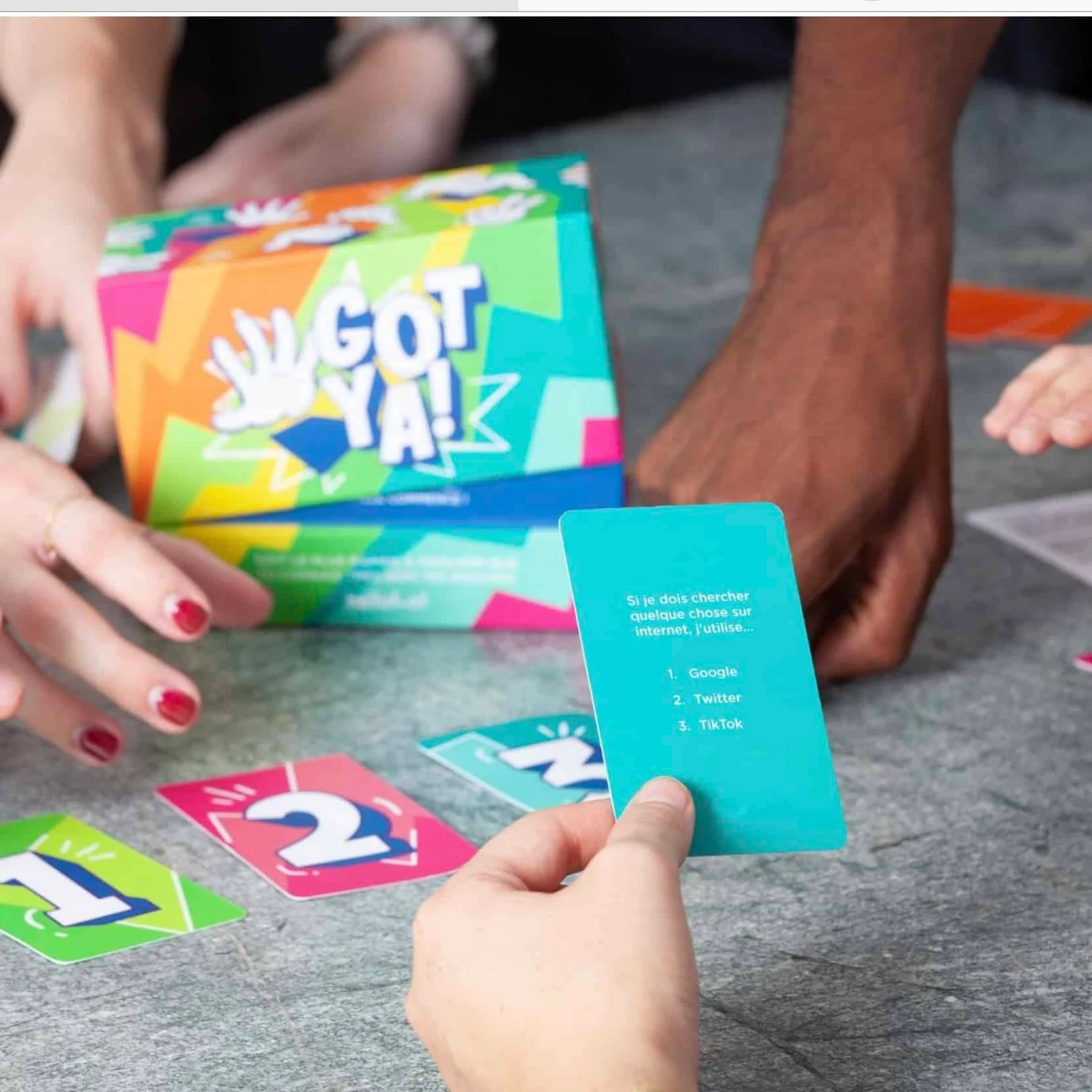 Dans ce jeu, choisis secrètement ta réponse et place la carte face cachée. Les autres participants devront être rapides pour essayer d’attraper la carte qu’ils pensent que vous avez choisie. Le jeu comporte 3 manches différentes au cours comprenant tu seras mis à l’épreuve pour découvrir à quel point tu connais vraiment ton entourage. Jusqu’à 5 réponses possibles sont à saisir… Prêts… Feu… Got Ya ! C’est un jeu qui teste vos connaissances et votre compréhension des autres participants, tout en ajoutant un élément de suspense et d’amusement.