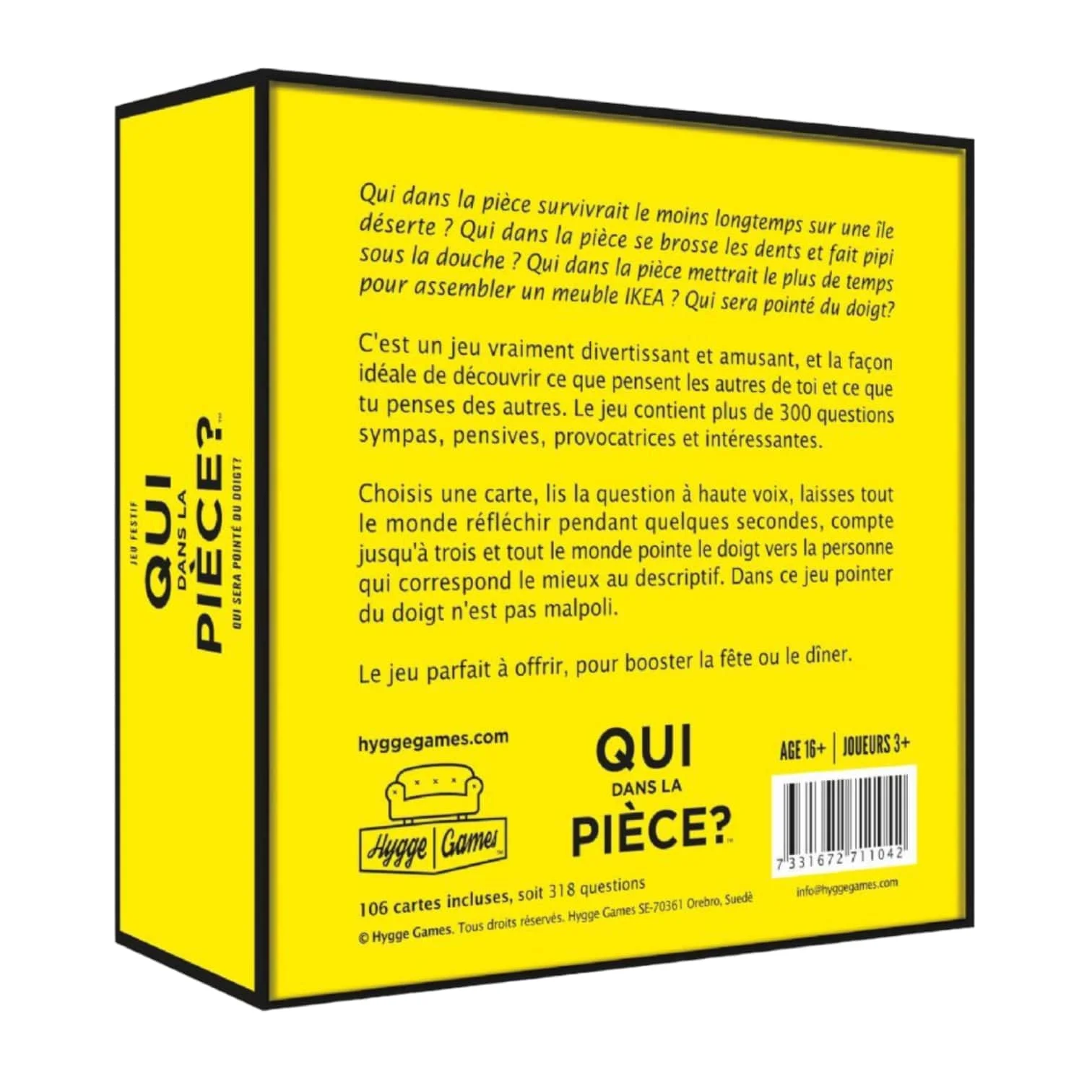 Jeu Qui dans la Pièce, Hygge Games. Ce jeu est une activité amusante et divertissante qui permet de mieux connaître les personnes présentes dans la pièce. Posez leur des questions et en incitez les à des réponses amusantes. Il s’agit d’une manière ludique de découvrir les opinions et les caractéristiques des participants, et de créer un environnement de jeu propice à la conversation et aux rires. N’hésitez pas à continuer à jouer et à poser ces questions pour en apprendre davantage sur les autres et sur vous-même.