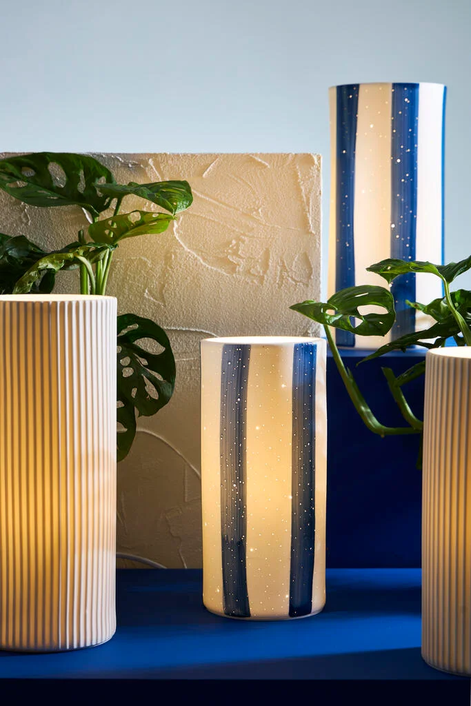 Craquez pour la lampe Alaria Indigo YLIADES : une pièce unique en porcelaine rayée indigo, qui allie lumière douce et design méditerranéen. Voir la : Gamme Alaria
