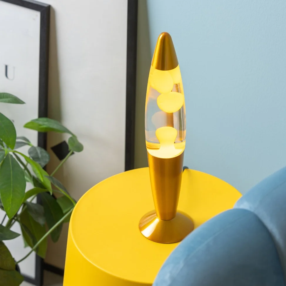 Offrez à votre intérieur un éclairage hors du commun avec la Lampe à Lave Funky de Present Time. Véritable clin d’œil aux années 70, cette lampe à lave jaune au design fusée hypnotise petits et grands grâce à ses mouvements de cire colorée et son style rétro-futuriste.