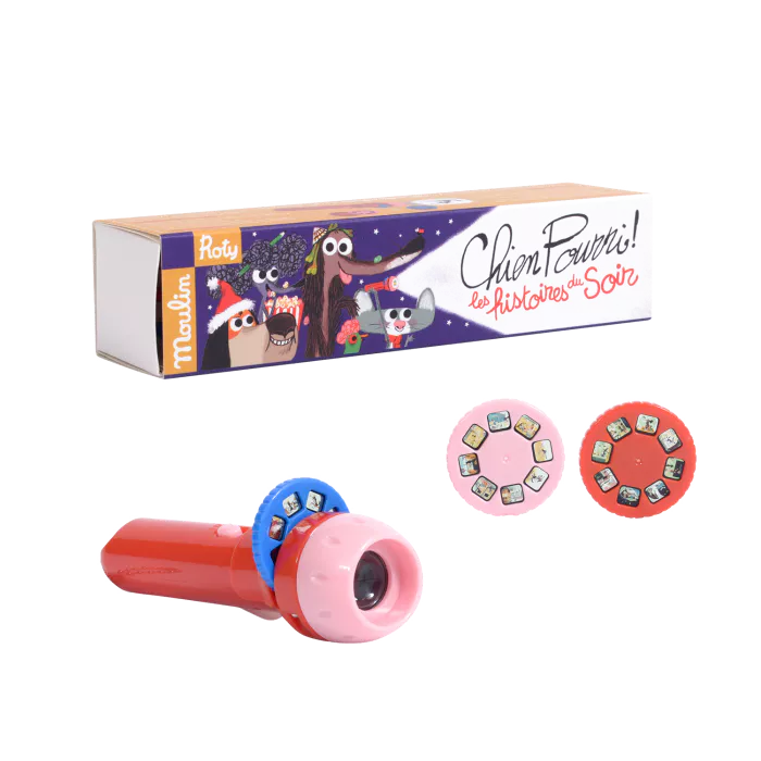 Lampe Torche à Histoires – Chien Pourri Lampe torche à histoires « Chien Pourri », avec 3 disques à projeter au mur. En collaboration avec l’École des Loisirs. Dès 4 ans. Dimensions : 16 x 4 cm.