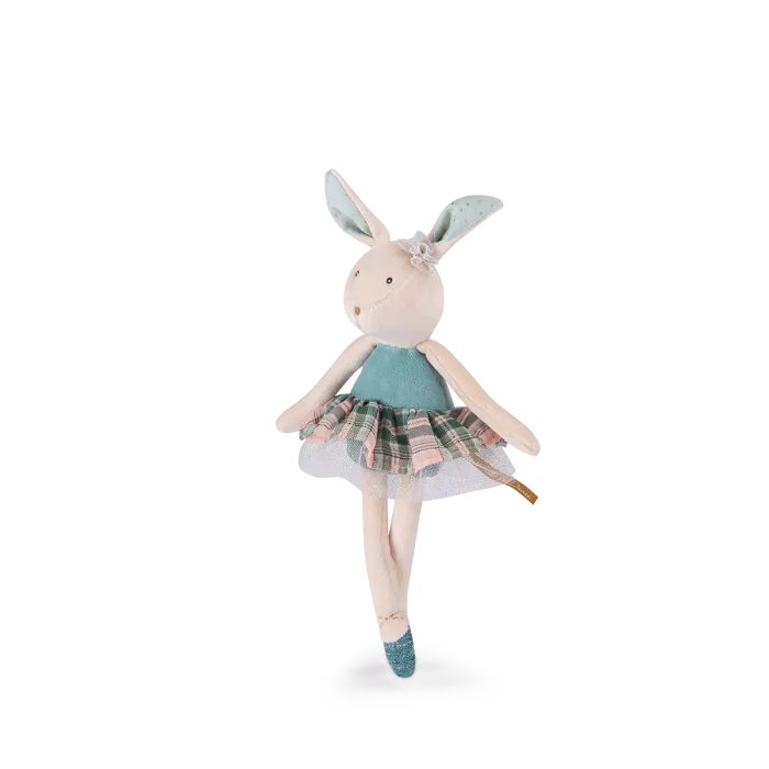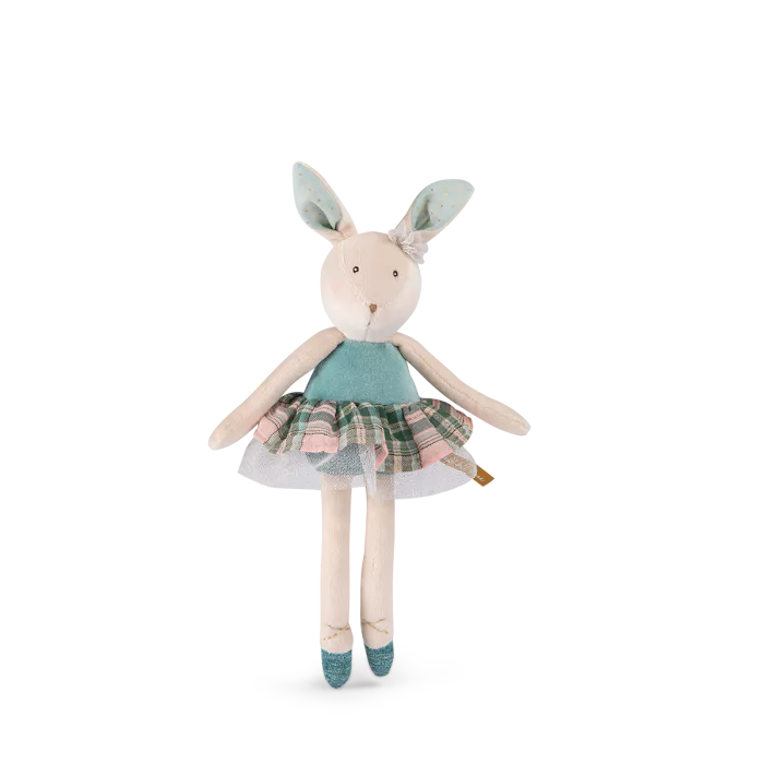 Lapin Bleu Petite Ecole de Danse, Moulin Roty. Vêtu d’une jupe tutu à carreaux, d’un petit nÅ“ud sur la tête et de ballerines nouées, ce petit lapin bleu respire l’élégance.