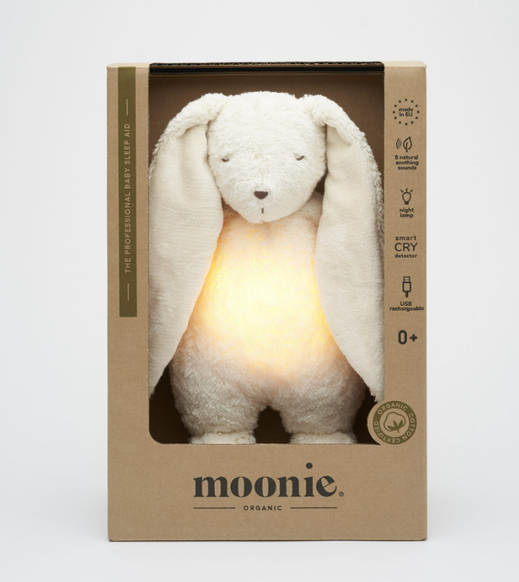 Le lapin polaire Moonie est l’aide au sommeil que tous les parents attendaient : veilleuse, berceuse, en coton bio et fabriqué en Europe. Qui dit mieux ?