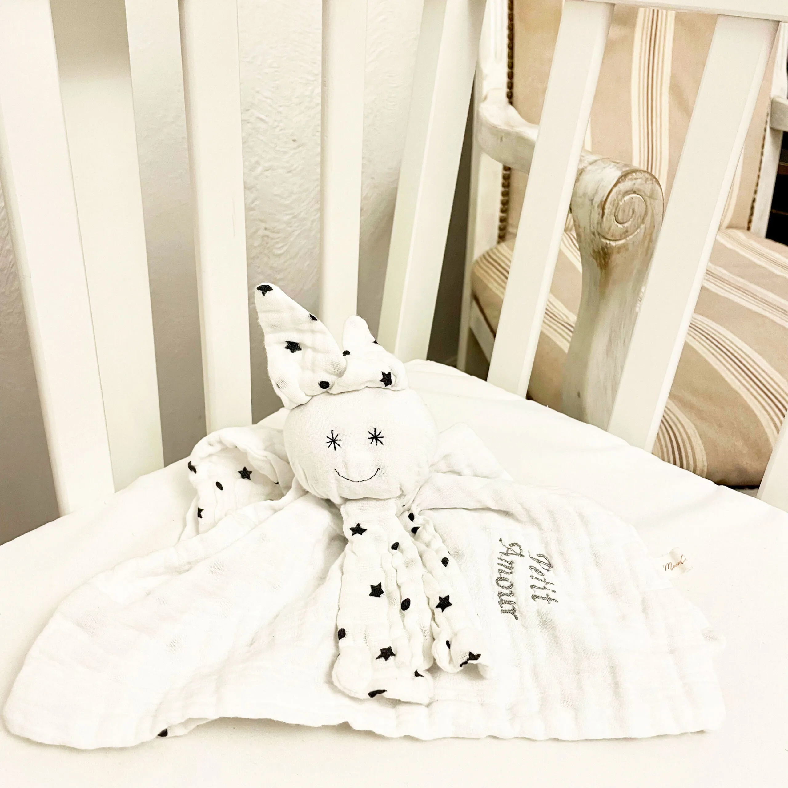 Lapinou doudou personnalisable en triple gaze de coton à motifs pois et étoiles.