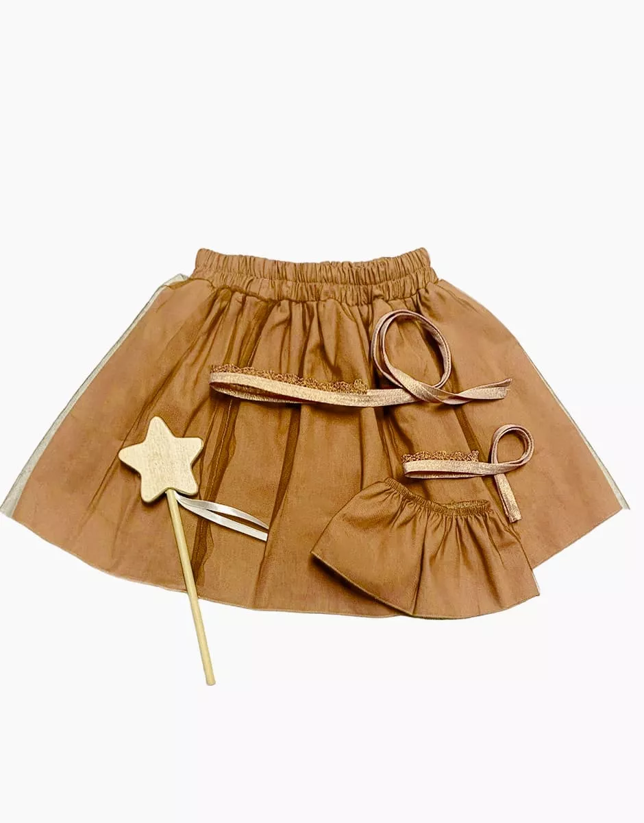 Duo de déguisements enfant/poupée « Petite fée ». Jupe élastiquée pour enfant. Taille unique : à partir de 3 ans jusqu’à 7/8 ans. Cet ensemble comprend : Un tutu pour enfant couleur cassonade. Un tutu pour poupée Minikane Gordis 34/37cm couleur cassonade. Une couronne pour enfant en dentelle cuivré. Une couronne pour poupée Minikane Gordis 34/37cm en dentelle cuivré. Une baguette magique en bois. Design, développement & confection made in France. Design, development & tailoring made in France. Photos non contractuelles.