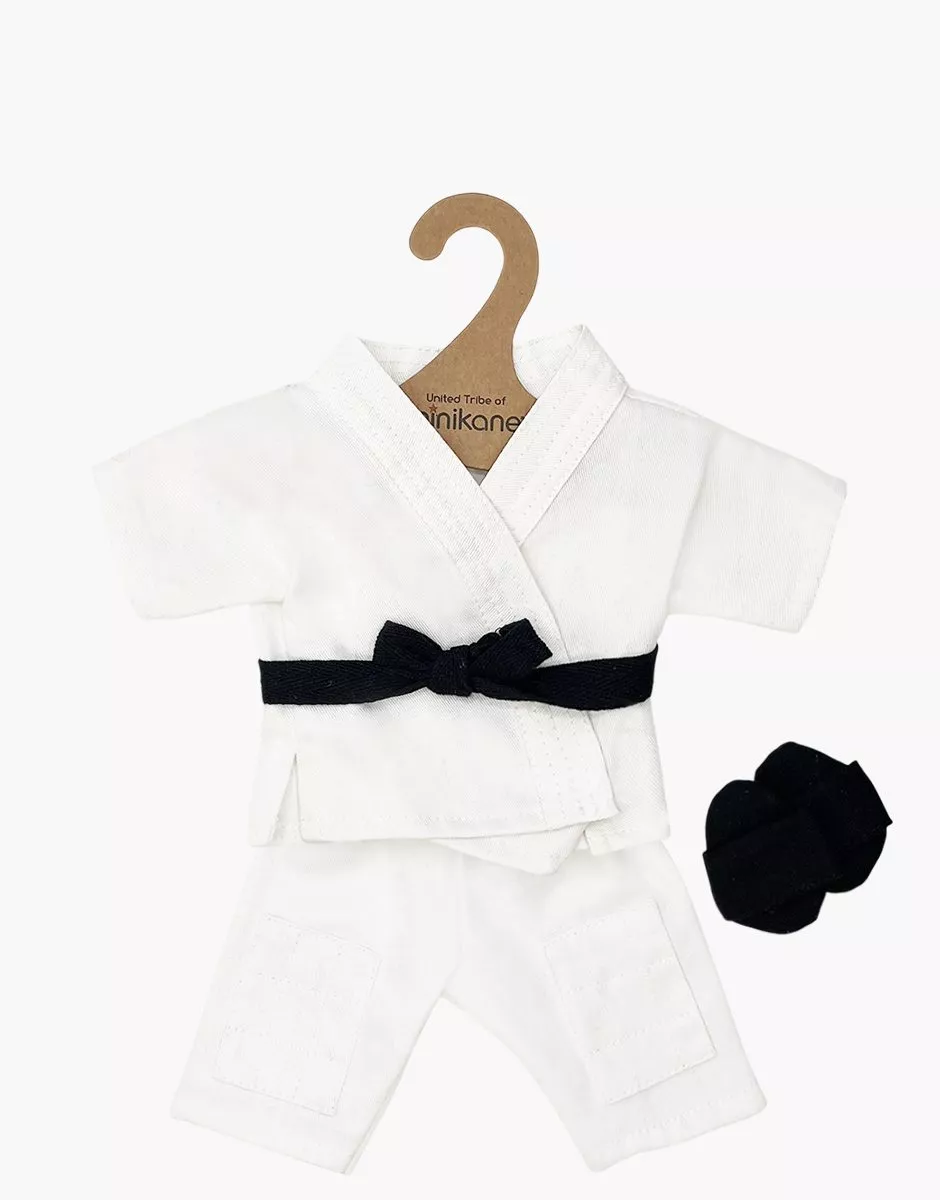 Déguisement de judoka et ses accessoires pour poupées et poupons Minikane Gordis 34 & 37cm. Vendu sans poupée. Le P’tit Déguiz’ est vendu dans son sachet zippé transparent et logoté avec une ouverture, laissant dépasser le haut du cintre pour une meilleure présentation. L’ensemble comprend : un ensemble kimono en coton blanc, une ceinture noire, une paire de chaussons claquettes noirs, un cintre en carton. Design, développement & confection MADE IN FRANCE. Design, development & tailoring made in France. Exclusive fabric patterns.